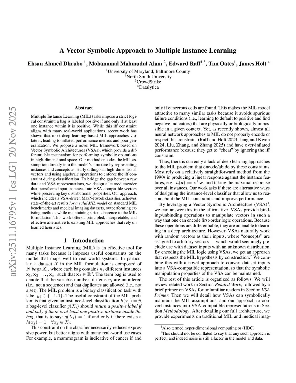 Multiple Instance Learning (MIL) tasks impose a strict logical constraint: a bag is labeled positive if and only if at least one instance within it is positive. While this iff constraint aligns with many real-world applications, recent work has shown that most deep learning-based MIL approaches violate it, leading to inflated performance metrics and poor generalization. We propose a novel MIL framework based on Vector Symbolic Architectures (VSAs), which provide a differentiable mechanism for performing symbolic operations in high-dimensional space. Our method encodes the MIL assumption directly into the model's structure by representing instances and concepts as nearly orthogonal high-dimensional vectors and using algebraic operations to enforce the iff constraint during classification. To bridge the gap between raw data and VSA representations, we design a learned encoder that transforms input instances into VSA-compatible vectors while preserving key distributional properties. Our approach, which includes a VSA-driven MaxNetwork classifier, achieves state-of-the-art results for a valid MIL model on standard MIL benchmarks and medical imaging datasets, outperforming existing methods while maintaining strict adherence to the MIL formulation. This work offers a principled, interpretable, and effective alternative to existing MIL approaches that rely on learned heuristics.
