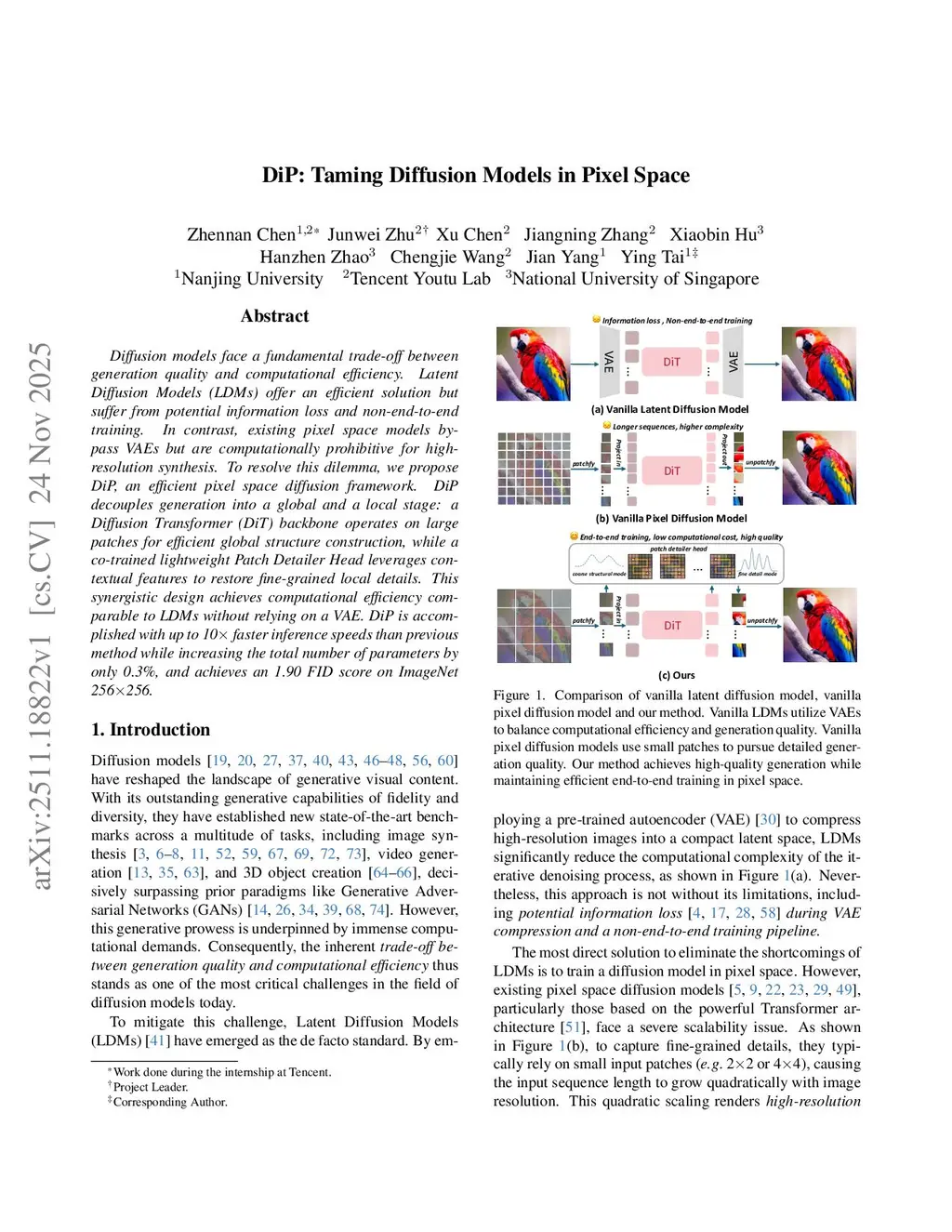 Diffusion models face a fundamental trade-off between generation quality and computational efficiency. Latent Diffusion Models (LDMs) offer an efficient solution but suffer from potential information loss and non-end-to-end training. In contrast, existing pixel space models bypass VAEs but are computationally prohibitive for high-resolution synthesis. To resolve this dilemma, we propose DiP, an efficient pixel space diffusion framework. DiP decouples generation into a global and a local stage: a Diffusion Transformer (DiT) backbone operates on large patches for efficient global structure construction, while a co-trained lightweight Patch Detailer Head leverages contextual features to restore fine-grained local details. This synergistic design achieves computational efficiency comparable to LDMs without relying on a VAE. DiP is accomplished with up to 10 faster inference speeds than previous method while increasing the total number of parameters by only 0.3%, and achieves an 1.79 FID score on ImageNet 256256.
