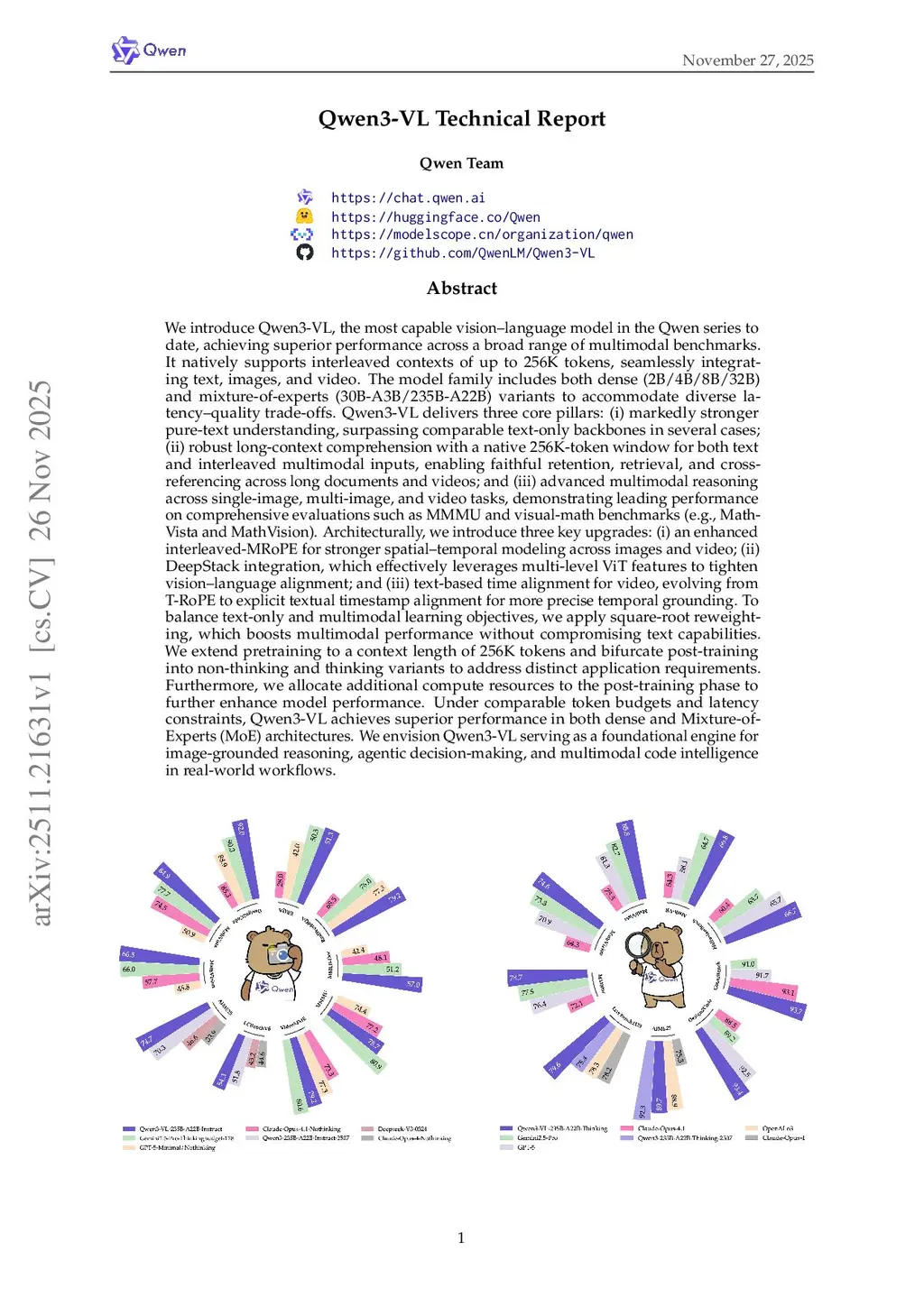 We introduce Qwen3-VL, the most capable vision-language model in the Qwen series to date, achieving superior performance across a broad range of multimodal benchmarks. It natively supports interleaved contexts of up to 256K tokens, seamlessly integrating text, images, and video. The model family includes both dense (2B/4B/8B/32B) and mixture-of-experts (30B-A3B/235B-A22B) variants to accommodate diverse latency-quality trade-offs. Qwen3-VL delivers three core pillars: (i) markedly stronger pure-text understanding, surpassing comparable text-only backbones in several cases; (ii) robust long-context comprehension with a native 256K-token window for both text and interleaved multimodal inputs, enabling faithful retention, retrieval, and cross-referencing across long documents and videos; and (iii) advanced multimodal reasoning across single-image, multi-image, and video tasks, demonstrating leading performance on comprehensive evaluations such as MMMU and visual-math benchmarks (e.g., MathVista and MathVision). Architecturally, we introduce three key upgrades: (i) an enhanced interleaved-MRoPE for stronger spatial-temporal modeling across images and video; (ii) DeepStack integration, which effectively leverages multi-level ViT features to tighten vision-language alignment; and (iii) text-based time alignment for video, evolving from T-RoPE to explicit textual timestamp alignment for more precise temporal grounding. Under comparable token budgets and latency constraints, Qwen3-VL achieves superior performance in both dense and Mixture-of-Experts (MoE) architectures. We envision Qwen3-VL serving as a foundational engine for image-grounded reasoning, agentic decision-making, and multimodal code intelligence in real-world workflows.