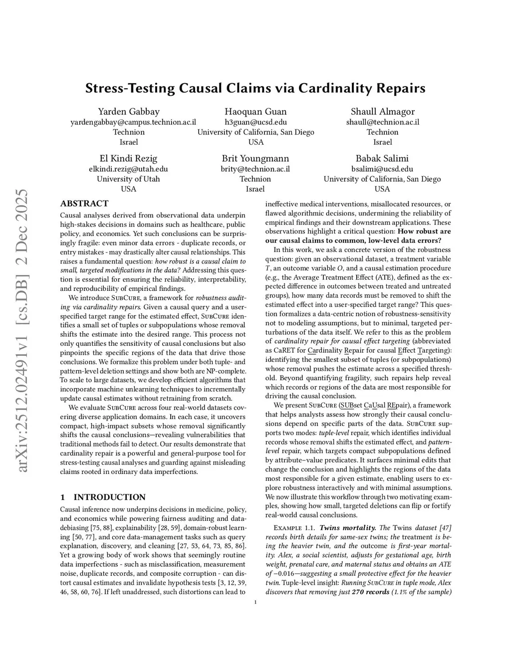 Causal analyses derived from observational data underpin high-stakes decisions in domains such as healthcare, public policy, and economics. Yet such conclusions can be surprisingly fragile: even minor data errors - duplicate records, or entry mistakes - may drastically alter causal relationships. This raises a fundamental question: how robust is a causal claim to small, targeted modifications in the data? Addressing this question is essential for ensuring the reliability, interpretability, and reproducibility of empirical findings. We introduce SubCure, a framework for robustness auditing via cardinality repairs. Given a causal query and a user-specified target range for the estimated effect, SubCure identifies a small set of tuples or subpopulations whose removal shifts the estimate into the desired range. This process not only quantifies the sensitivity of causal conclusions but also pinpoints the specific regions of the data that drive those conclusions. We formalize this problem under both tuple- and pattern-level deletion settings and show both are NP-complete. To scale to large datasets, we develop efficient algorithms that incorporate machine unlearning techniques to incrementally update causal estimates without retraining from scratch. We evaluate SubCure across four real-world datasets covering diverse application domains. In each case, it uncovers compact, high-impact subsets whose removal significantly shifts the causal conclusions, revealing vulnerabilities that traditional methods fail to detect. Our results demonstrate that cardinality repair is a powerful and general-purpose tool for stress-testing causal analyses and guarding against misleading claims rooted in ordinary data imperfections.