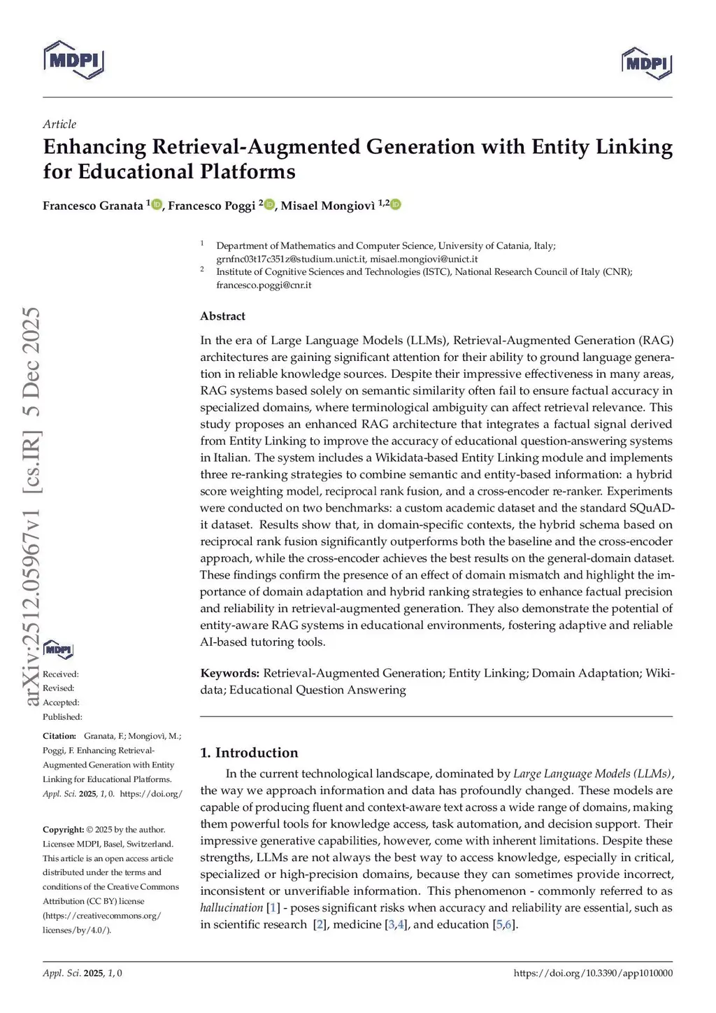 In the era of Large Language Models (LLMs), Retrieval-Augmented Generation (RAG) architectures are gaining significant attention for their ability to ground language generation in reliable knowledge sources. Despite their effectiveness, RAG systems based solely on semantic similarity often fail to ensure factual accuracy in specialized domains, where terminological ambiguity can affect retrieval relevance. This study proposes ELERAG, an enhanced RAG architecture that integrates a factual signal derived from Entity Linking to improve the accuracy of educational question-answering systems in Italian. The system includes a Wikidata-based Entity Linking module and implements a hybrid re-ranking strategy based on Reciprocal Rank Fusion (RRF). To validate our approach, we compared it against standard baselines and state-of-the-art methods, including a Weighted-Score Re-ranking, a standalone Cross-Encoder and a combined RRF+Cross-Encoder pipeline. Experiments were conducted on two benchmarks: a custom academic dataset and the standard SQuAD-it dataset. Results show that, in domain-specific contexts, ELERAG significantly outperforms both the baseline and the Cross-Encoder configurations. Conversely, the Cross-Encoder approaches achieve the best results on the general-domain dataset. These findings provide strong experimental evidence of the domain mismatch effect, highlighting the importance of domain-adapted hybrid strategies to enhance factual precision in educational RAG systems without relying on computationally expensive models trained on disparate data distributions. They also demonstrate the potential of entity-aware RAG systems in educational environments, fostering adaptive and reliable AI-based tutoring tools.
