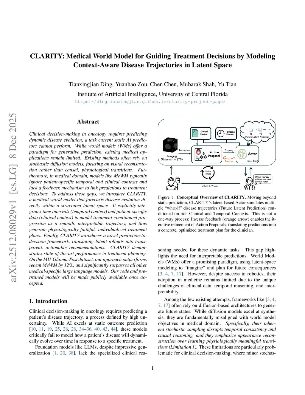 Clinical decision-making in oncology requires predicting dynamic disease evolution, a task current static AI predictors cannot perform. While world models (WMs) offer a paradigm for generative prediction, existing medical applications remain limited. Existing methods often rely on stochastic diffusion models, focusing on visual reconstruction rather than causal, physiological transitions. Furthermore, in medical domain, models like MeWM typically ignore patient-specific temporal and clinical contexts and lack a feedback mechanism to link predictions to treatment decisions. To address these gaps, we introduce CLARITY, a medical world model that forecasts disease evolution directly within a structured latent space. It explicitly integrates time intervals (temporal context) and patient-specific data (clinical context) to model treatment-conditioned progression as a smooth, interpretable trajectory, and thus generate physiologically faithful, individualized treatment plans. Finally, CLARITY introduces a novel prediction-to-decision framework, translating latent rollouts into transparent, actionable recommendations. CLARITY demonstrates state-of-the-art performance in treatment planning. On the MU-Glioma-Post dataset, our approach outperforms recent MeWM by 12\%, and significantly surpasses all other medical-specific large language models.