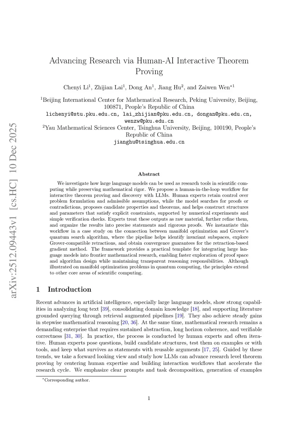 We investigate how large language models can be used as research tools in scientific computing while preserving mathematical rigor. We propose a human-in-the-loop workflow for interactive theorem proving and discovery with LLMs. Human experts retain control over problem formulation and admissible assumptions, while the model searches for proofs or contradictions, proposes candidate properties and theorems, and helps construct structures and parameters that satisfy explicit constraints, supported by numerical experiments and simple verification checks. Experts treat these outputs as raw material, further refine them, and organize the results into precise statements and rigorous proofs. We instantiate this workflow in a case study on the connection between manifold optimization and Grover's quantum search algorithm, where the pipeline helps identify invariant subspaces, explore Grover-compatible retractions, and obtain convergence guarantees for the retraction-based gradient method. The framework provides a practical template for integrating large language models into frontier mathematical research, enabling faster exploration of proof space and algorithm design while maintaining transparent reasoning responsibilities. Although illustrated on manifold optimization problems in quantum computing, the principles extend to other core areas of scientific computing.