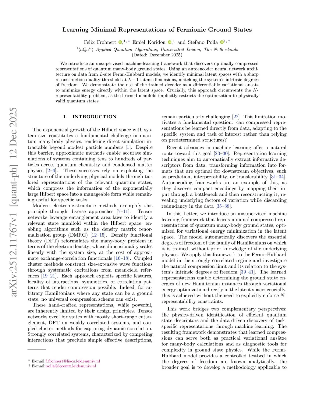 We introduce an unsupervised machine-learning framework that discovers optimally compressed representations of quantum many-body ground states. Using an autoencoder neural network architecture on data from -site Fermi-Hubbard models, we identify minimal latent spaces with a sharp reconstruction quality threshold at latent dimensions, matching the system's intrinsic degrees of freedom. We demonstrate the use of the trained decoder as a differentiable variational ansatz to minimize energy directly within the latent space. Crucially, this approach circumvents the -representability problem, as the learned manifold implicitly restricts the optimization to physically valid quantum states.