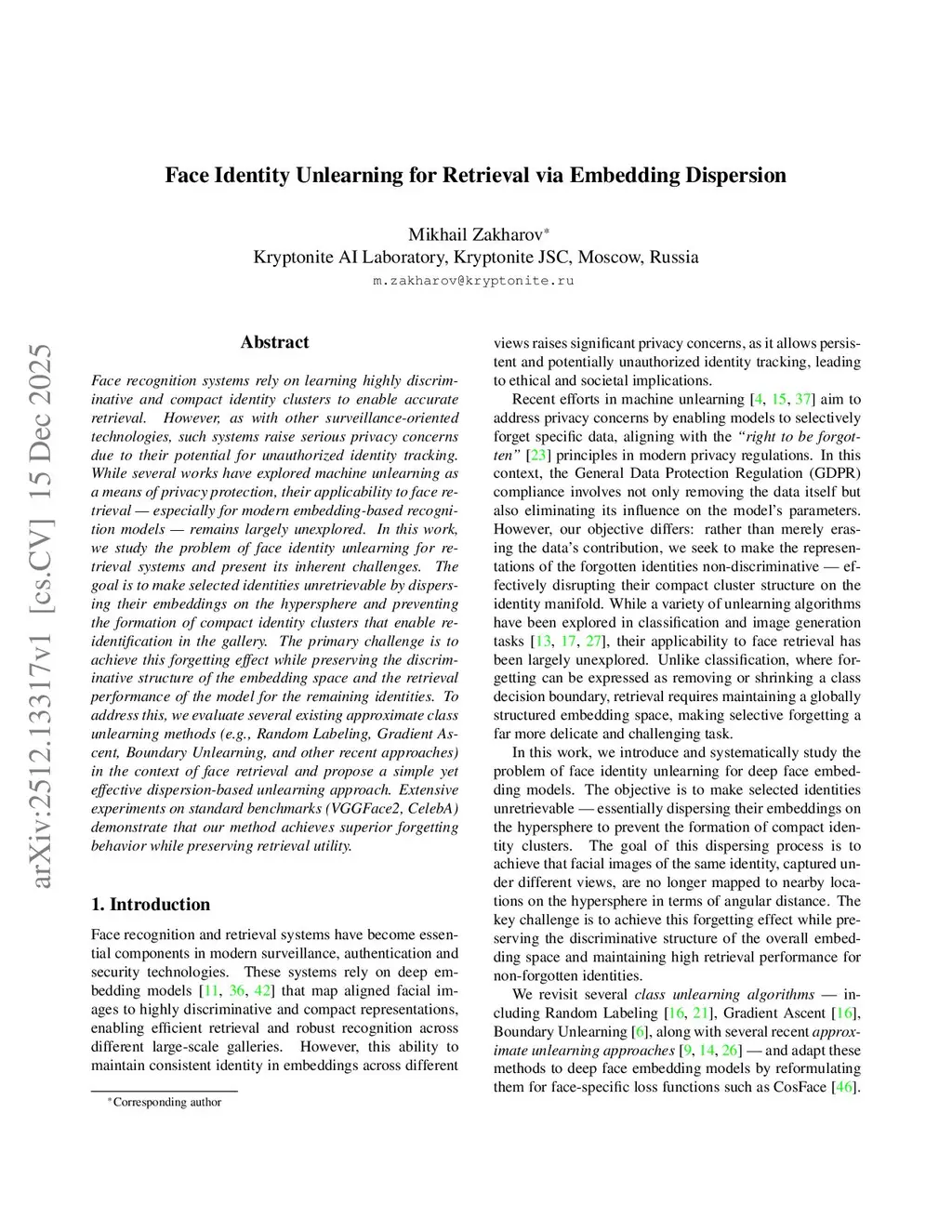 Face recognition systems rely on learning highly discriminative and compact identity clusters to enable accurate retrieval. However, as with other surveillance-oriented technologies, such systems raise serious privacy concerns due to their potential for unauthorized identity tracking. While several works have explored machine unlearning as a means of privacy protection, their applicability to face retrieval - especially for modern embedding-based recognition models - remains largely unexplored. In this work, we study the problem of face identity unlearning for retrieval systems and present its inherent challenges. The goal is to make selected identities unretrievable by dispersing their embeddings on the hypersphere and preventing the formation of compact identity clusters that enable re-identification in the gallery. The primary challenge is to achieve this forgetting effect while preserving the discriminative structure of the embedding space and the retrieval performance of the model for the remaining identities. To address this, we evaluate several existing approximate class unlearning methods (e.g., Random Labeling, Gradient Ascent, Boundary Unlearning, and other recent approaches) in the context of face retrieval and propose a simple yet effective dispersion-based unlearning approach. Extensive experiments on standard benchmarks (VGGFace2, CelebA) demonstrate that our method achieves superior forgetting behavior while preserving retrieval utility.