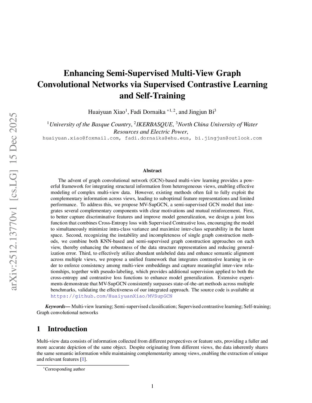 Enhancing Semi-Supervised Multi-View Graph Convolutional Networks via Supervised Contrastive Learning and Self-Training