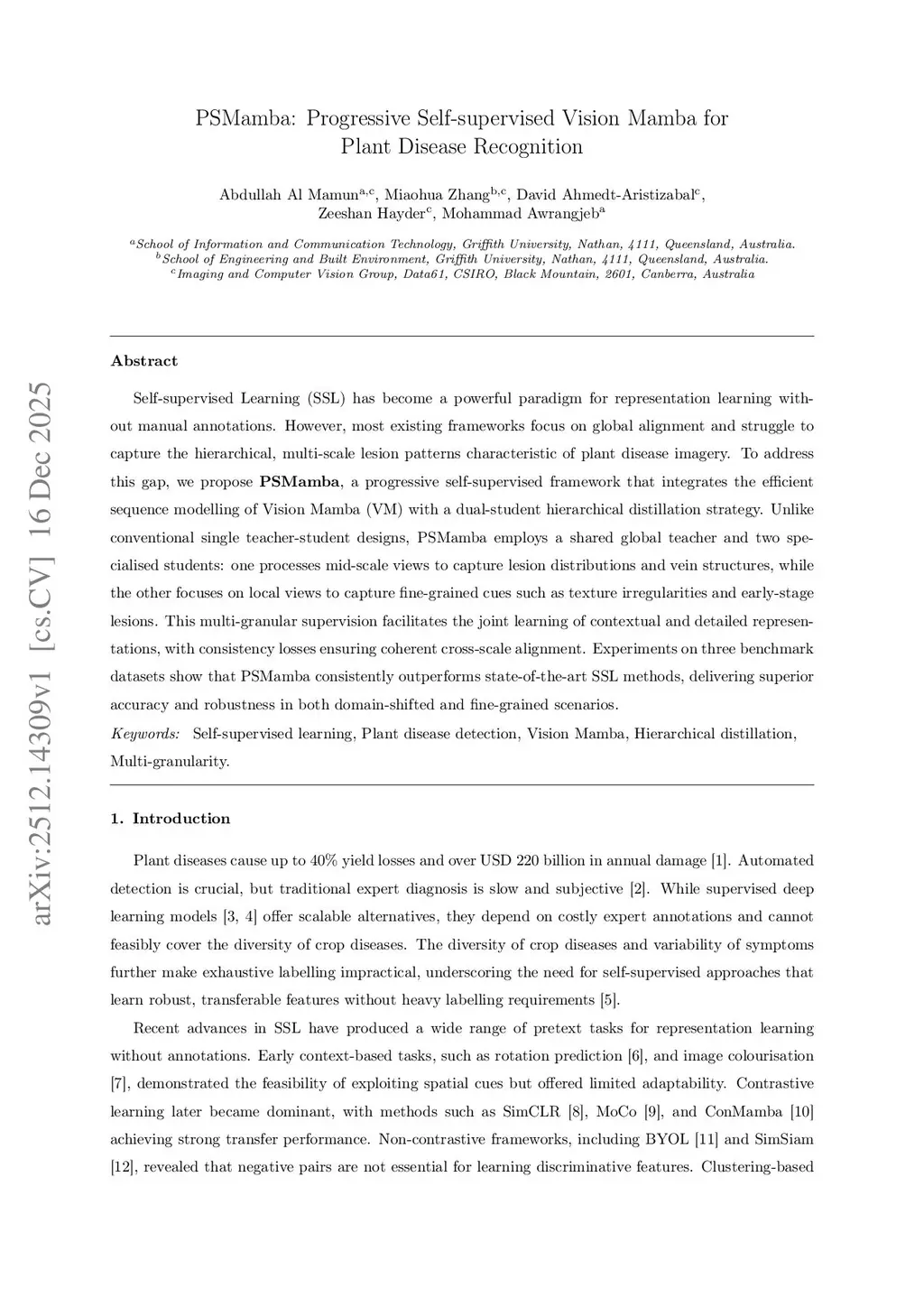 Self-supervised Learning (SSL) has become a powerful paradigm for representation learning without manual annotations. However, most existing frameworks focus on global alignment and struggle to capture the hierarchical, multi-scale lesion patterns characteristic of plant disease imagery. To address this gap, we propose PSMamba, a progressive self-supervised framework that integrates the efficient sequence modelling of Vision Mamba (VM) with a dual-student hierarchical distillation strategy. Unlike conventional single teacher-student designs, PSMamba employs a shared global teacher and two specialised students: one processes mid-scale views to capture lesion distributions and vein structures, while the other focuses on local views to capture fine-grained cues such as texture irregularities and early-stage lesions. This multi-granular supervision facilitates the joint learning of contextual and detailed representations, with consistency losses ensuring coherent cross-scale alignment. Experiments on three benchmark datasets show that PSMamba consistently outperforms state-of-the-art SSL methods, delivering superior accuracy and robustness in both domain-shifted and fine-grained scenarios.