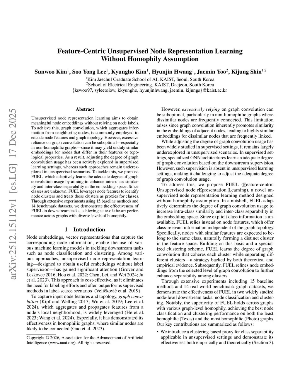 Unsupervised node representation learning aims to obtain meaningful node embeddings without relying on node labels. To achieve this, graph convolution, which aggregates information from neighboring nodes, is commonly employed to encode node features and graph topology. However, excessive reliance on graph convolution can be suboptimal-especially in non-homophilic graphs-since it may yield unduly similar embeddings for nodes that differ in their features or topological properties. As a result, adjusting the degree of graph convolution usage has been actively explored in supervised learning settings, whereas such approaches remain underexplored in unsupervised scenarios. To tackle this, we propose FUEL, which adaptively learns the adequate degree of graph convolution usage by aiming to enhance intra-class similarity and inter-class separability in the embedding space. Since classes are unknown, FUEL leverages node features to identify node clusters and treats these clusters as proxies for classes. Through extensive experiments using 15 baseline methods and 14 benchmark datasets, we demonstrate the effectiveness of FUEL in downstream tasks, achieving state-of-the-art performance across graphs with diverse levels of homophily.