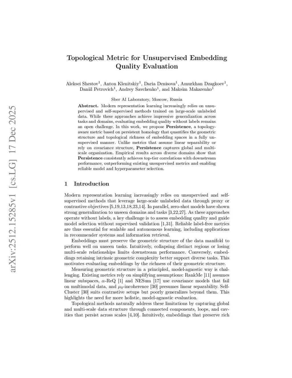 Modern representation learning increasingly relies on unsupervised and self-supervised methods trained on large-scale unlabeled data. While these approaches achieve impressive generalization across tasks and domains, evaluating embedding quality without labels remains an open challenge. In this work, we propose Persistence, a topology-aware metric based on persistent homology that quantifies the geometric structure and topological richness of embedding spaces in a fully unsupervised manner. Unlike metrics that assume linear separability or rely on covariance structure, Persistence captures global and multi-scale organization. Empirical results across diverse domains show that Persistence consistently achieves top-tier correlations with downstream performance, outperforming existing unsupervised metrics and enabling reliable model and hyperparameter selection.