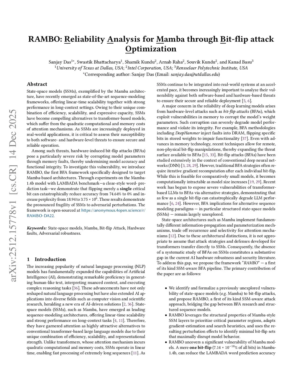 State-space models (SSMs), exemplified by the Mamba architecture, have recently emerged as state-of-the-art sequence-modeling frameworks, offering linear-time scalability together with strong performance in long-context settings. Owing to their unique combination of efficiency, scalability, and expressive capacity, SSMs have become compelling alternatives to transformer-based models, which suffer from the quadratic computational and memory costs of attention mechanisms. As SSMs are increasingly deployed in real-world applications, it is critical to assess their susceptibility to both software- and hardware-level threats to ensure secure and reliable operation. Among such threats, hardware-induced bit-flip attacks (BFAs) pose a particularly severe risk by corrupting model parameters through memory faults, thereby undermining model accuracy and functional integrity. To investigate this vulnerability, we introduce RAMBO, the first BFA framework specifically designed to target Mamba-based architectures. Through experiments on the Mamba-1.4b model with LAMBADA benchmark, a cloze-style word-prediction task, we demonstrate that flipping merely a single critical bit can catastrophically reduce accuracy from 74.64% to 0% and increase perplexity from 18.94 to 3.75 x 10^6. These results demonstrate the pronounced fragility of SSMs to adversarial perturbations.
