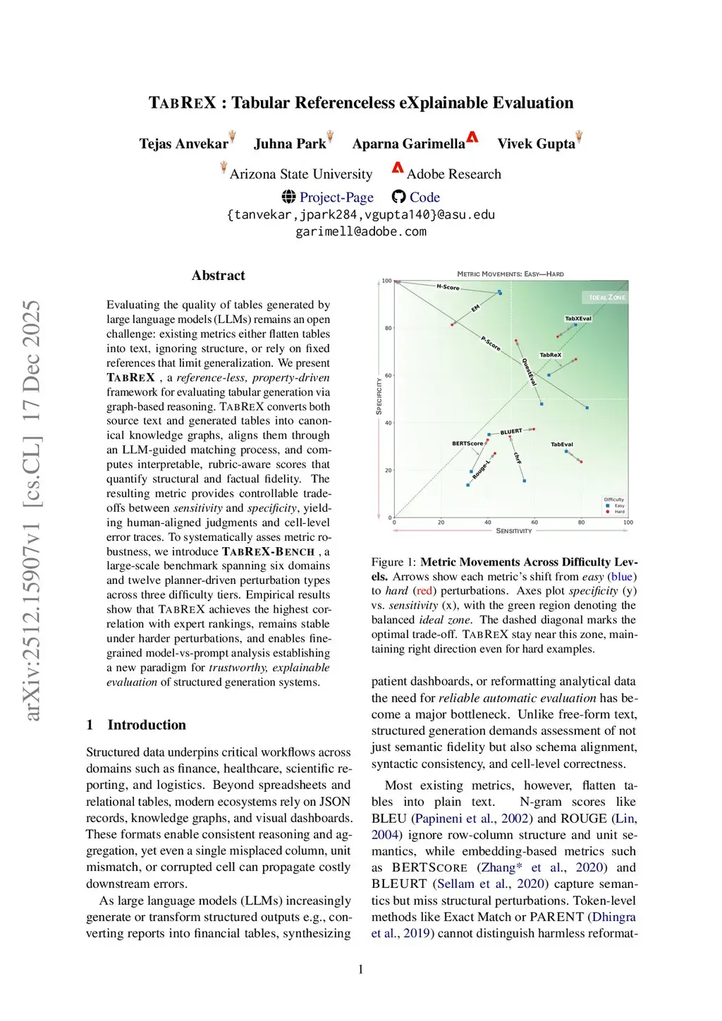 Evaluating the quality of tables generated by large language models (LLMs) remains an open challenge: existing metrics either flatten tables into text, ignoring structure, or rely on fixed references that limit generalization. We present TabReX, a reference-less, property-driven framework for evaluating tabular generation via graph-based reasoning. TabReX converts both source text and generated tables into canonical knowledge graphs, aligns them through an LLM-guided matching process, and computes interpretable, rubric-aware scores that quantify structural and factual fidelity. The resulting metric provides controllable trade-offs between sensitivity and specificity, yielding human-aligned judgments and cell-level error traces. To systematically asses metric robustness, we introduce TabReX-Bench, a large-scale benchmark spanning six domains and twelve planner-driven perturbation types across three difficulty tiers. Empirical results show that TabReX achieves the highest correlation with expert rankings, remains stable under harder perturbations, and enables fine-grained model-vs-prompt analysis establishing a new paradigm for trustworthy, explainable evaluation of structured generation systems.