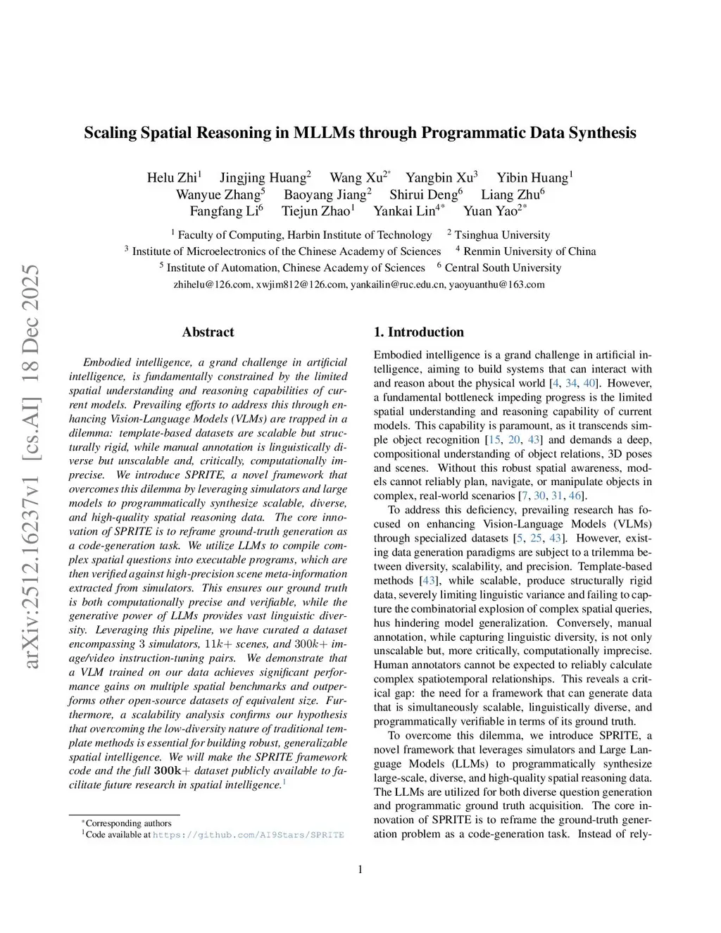 Embodied intelligence, a grand challenge in artificial intelligence, is fundamentally constrained by the limited spatial understanding and reasoning capabilities of current models. Prevailing efforts to address this through enhancing Vision-Language Models (VLMs) are trapped in a dilemma: template-based datasets are scalable but structurally rigid, while manual annotation is linguistically diverse but unscalable and, critically, computationally imprecise. We introduce SPRITE, a novel framework that overcomes this dilemma by leveraging simulators and large models to programmatically synthesize scalable, diverse, and high-quality spatial reasoning data. The core innovation of SPRITE is to reframe ground-truth generation as a code-generation task. We utilize LLMs to compile complex spatial questions into executable programs, which are then verified against high-precision scene meta-information extracted from simulators. This ensures our ground truth is both computationally precise and verifiable, while the generative power of LLMs provides vast linguistic diversity. Leveraging this pipeline, we have curated a dataset encompassing 3 simulators, 11k+ scenes, and 300k+ image/video instruction-tuning pairs. We demonstrate that a VLM trained on our data achieves significant performance gains on multiple spatial benchmarks and outperforms other open-source datasets of equivalent size. Furthermore, a scalability analysis confirms our hypothesis that overcoming the low-diversity nature of traditional template methods is essential for building robust, generalizable spatial intelligence. We will make the SPRITE framework code and the full 300k+ dataset publicly available to facilitate future research in spatial intelligence.