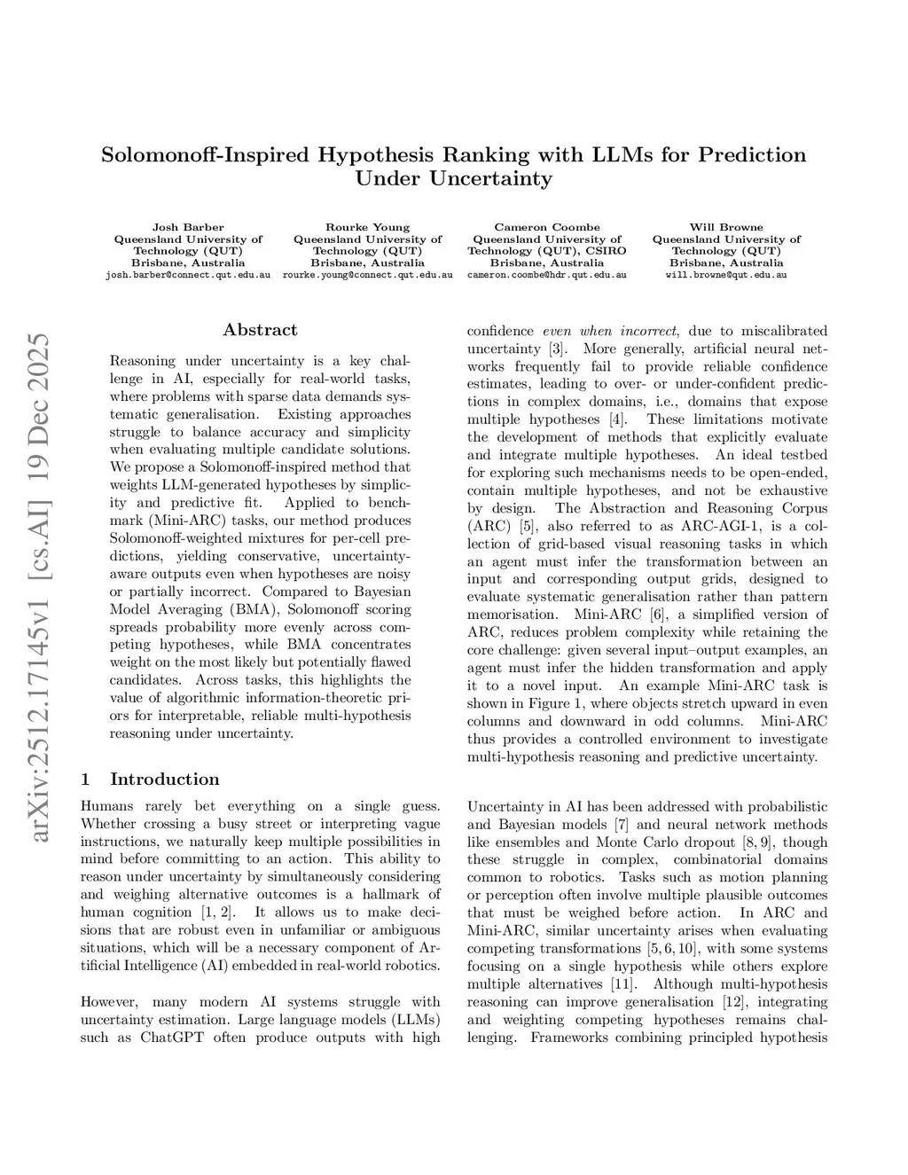 Reasoning under uncertainty is a key challenge in AI, especially for real-world tasks, where problems with sparse data demands systematic generalisation. Existing approaches struggle to balance accuracy and simplicity when evaluating multiple candidate solutions. We propose a Solomonoff-inspired method that weights LLM-generated hypotheses by simplicity and predictive fit. Applied to benchmark (Mini-ARC) tasks, our method produces Solomonoff-weighted mixtures for per-cell predictions, yielding conservative, uncertainty-aware outputs even when hypotheses are noisy or partially incorrect. Compared to Bayesian Model Averaging (BMA), Solomonoff scoring spreads probability more evenly across competing hypotheses, while BMA concentrates weight on the most likely but potentially flawed candidates. Across tasks, this highlights the value of algorithmic information-theoretic priors for interpretable, reliable multi-hypothesis reasoning under uncertainty.