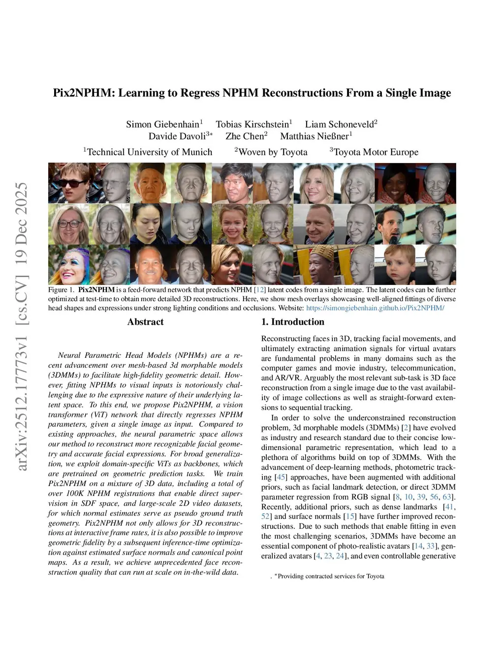 Neural Parametric Head Models (NPHMs) are a recent advancement over mesh-based 3d morphable models (3DMMs) to facilitate high-fidelity geometric detail. However, fitting NPHMs to visual inputs is notoriously challenging due to the expressive nature of their underlying latent space. To this end, we propose Pix2NPHM, a vision transformer (ViT) network that directly regresses NPHM parameters, given a single image as input. Compared to existing approaches, the neural parametric space allows our method to reconstruct more recognizable facial geometry and accurate facial expressions. For broad generalization, we exploit domain-specific ViTs as backbones, which are pretrained on geometric prediction tasks. We train Pix2NPHM on a mixture of 3D data, including a total of over 100K NPHM registrations that enable direct supervision in SDF space, and large-scale 2D video datasets, for which normal estimates serve as pseudo ground truth geometry. Pix2NPHM not only allows for 3D reconstructions at interactive frame rates, it is also possible to improve geometric fidelity by a subsequent inference-time optimization against estimated surface normals and canonical point maps. As a result, we achieve unprecedented face reconstruction quality that can run at scale on in-the-wild data.