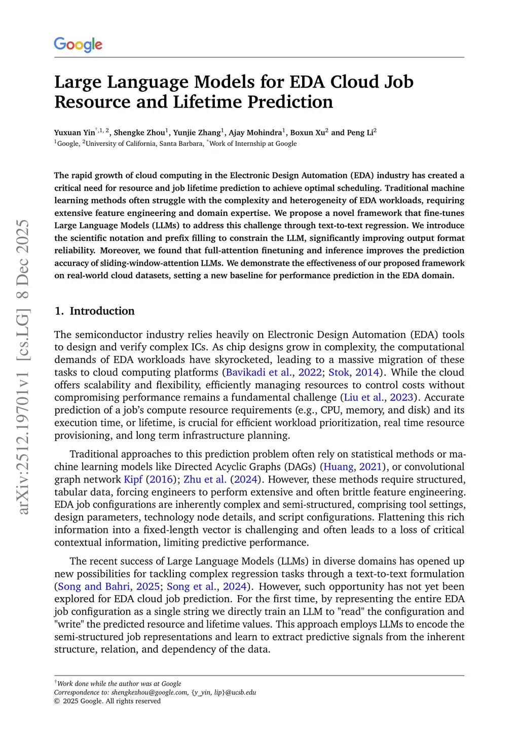 The rapid growth of cloud computing in the Electronic Design Automation (EDA) industry has created a critical need for resource and job lifetime prediction to achieve optimal scheduling. Traditional machine learning methods often struggle with the complexity and heterogeneity of EDA workloads, requiring extensive feature engineering and domain expertise. We propose a novel framework that fine-tunes Large Language Models (LLMs) to address this challenge through text-to-text regression. We introduce the scientific notation and prefix filling to constrain the LLM, significantly improving output format reliability. Moreover, we found that full-attention finetuning and inference improves the prediction accuracy of sliding-window-attention LLMs. We demonstrate the effectiveness of our proposed framework on real-world cloud datasets, setting a new baseline for performance prediction in the EDA domain.