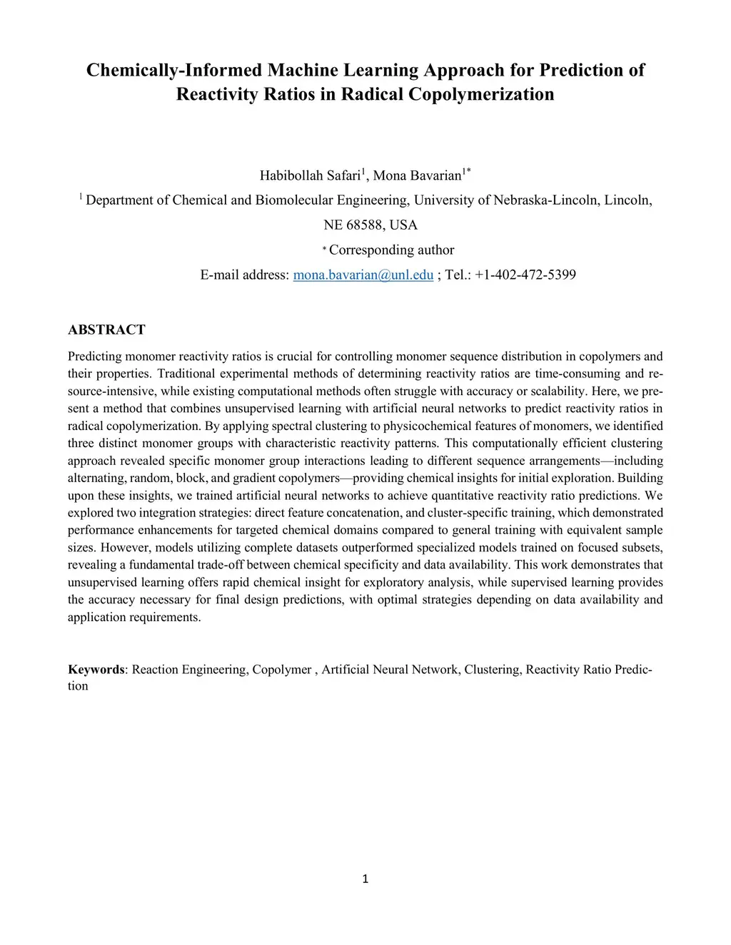 Predicting monomer reactivity ratios is crucial for controlling monomer sequence distribution in copolymers and their properties. Traditional experimental methods of determining reactivity ratios are time-consuming and resource-intensive, while existing computational methods often struggle with accuracy or scalability. Here, we present a method that combines unsupervised learning with artificial neural networks to predict reactivity ratios in radical copolymerization. By applying spectral clustering to physicochemical features of monomers, we identified three distinct monomer groups with characteristic reactivity patterns. This computationally efficient clustering approach revealed specific monomer group interactions leading to different sequence arrangements, including alternating, random, block, and gradient copolymers, providing chemical insights for initial exploration. Building upon these insights, we trained artificial neural networks to achieve quantitative reactivity ratio predictions. We explored two integration strategies including direct feature concatenation, and cluster-specific training, which demonstrated performance enhancements for targeted chemical domains compared to general training with equivalent sample sizes. However, models utilizing complete datasets outperformed specialized models trained on focused subsets, revealing a fundamental trade-off between chemical specificity and data availability. This work demonstrates that unsupervised learning offers rapid chemical insight for exploratory analysis, while supervised learning provides the accuracy necessary for final design predictions, with optimal strategies depending on data availability and application requirements.