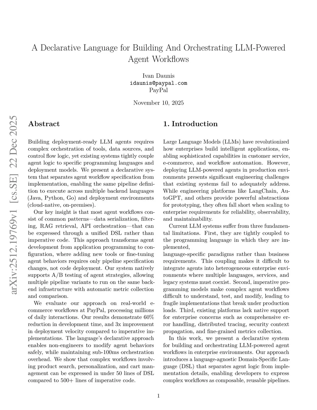 Building deployment-ready LLM agents requires complex orchestration of tools, data sources, and control flow logic, yet existing systems tightly couple agent logic to specific programming languages and deployment models. We present a declarative system that separates agent workflow specification from implementation, enabling the same pipeline definition to execute across multiple backend languages (Java, Python, Go) and deployment environments (cloud-native, on-premises).Our key insight is that most agent workflows consist of common patterns -- data serialization, filtering, RAG retrieval, API orchestration -- that can be expressed through a unified DSL rather than imperative code. This approach transforms agent development from application programming to configuration, where adding new tools or fine-tuning agent behaviors requires only pipeline specification changes, not code deployment. Our system natively supports A/B testing of agent strategies, allowing multiple pipeline variants to run on the same backend infrastructure with automatic metric collection and comparison.We evaluate our approach on real-world e-commerce workflows at PayPal, processing millions of daily interactions. Our results demonstrate 60% reduction in development time, and 3x improvement in deployment velocity compared to imperative implementations. The language's declarative approach enables non-engineers to modify agent behaviors safely, while maintaining sub-100ms orchestration overhead. We show that complex workflows involving product search, personalization, and cart management can be expressed in under 50 lines of DSL compared to 500+ lines of imperative code.