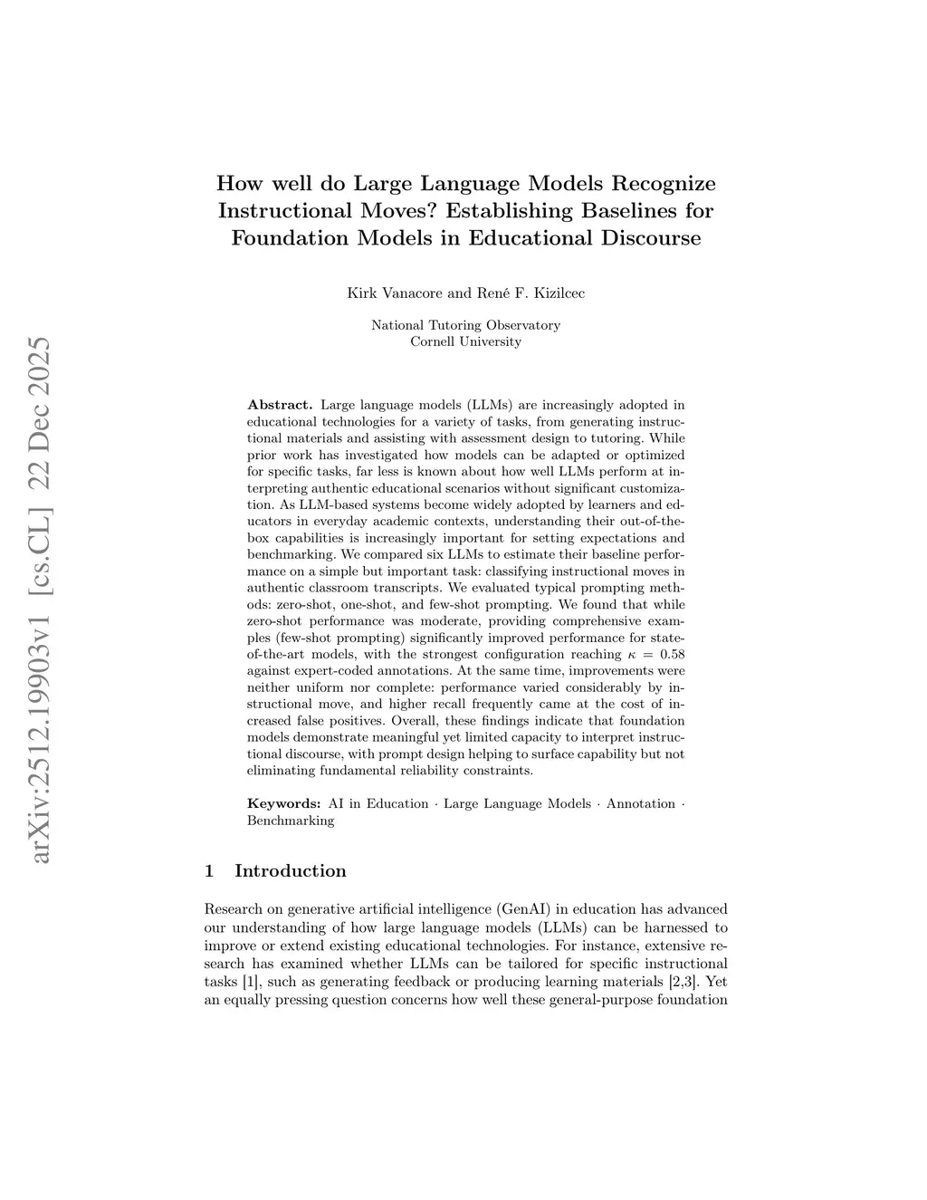 Large language models (LLMs) are increasingly adopted in educational technologies for a variety of tasks, from generating instructional materials and assisting with assessment design to tutoring. While prior work has investigated how models can be adapted or optimized for specific tasks, far less is known about how well LLMs perform at interpreting authentic educational scenarios without significant customization. As LLM-based systems become widely adopted by learners and educators in everyday academic contexts, understanding their out-of-the-box capabilities is increasingly important for setting expectations and benchmarking. We compared six LLMs to estimate their baseline performance on a simple but important task: classifying instructional moves in authentic classroom transcripts. We evaluated typical prompting methods: zero-shot, one-shot, and few-shot prompting. We found that while zero-shot performance was moderate, providing comprehensive examples (few-shot prompting) significantly improved performance for state-of-the-art models, with the strongest configuration reaching Cohen's Kappa = 0.58 against expert-coded annotations. At the same time, improvements were neither uniform nor complete: performance varied considerably by instructional move, and higher recall frequently came at the cost of increased false positives. Overall, these findings indicate that foundation models demonstrate meaningful yet limited capacity to interpret instructional discourse, with prompt design helping to surface capability but not eliminating fundamental reliability constraints.