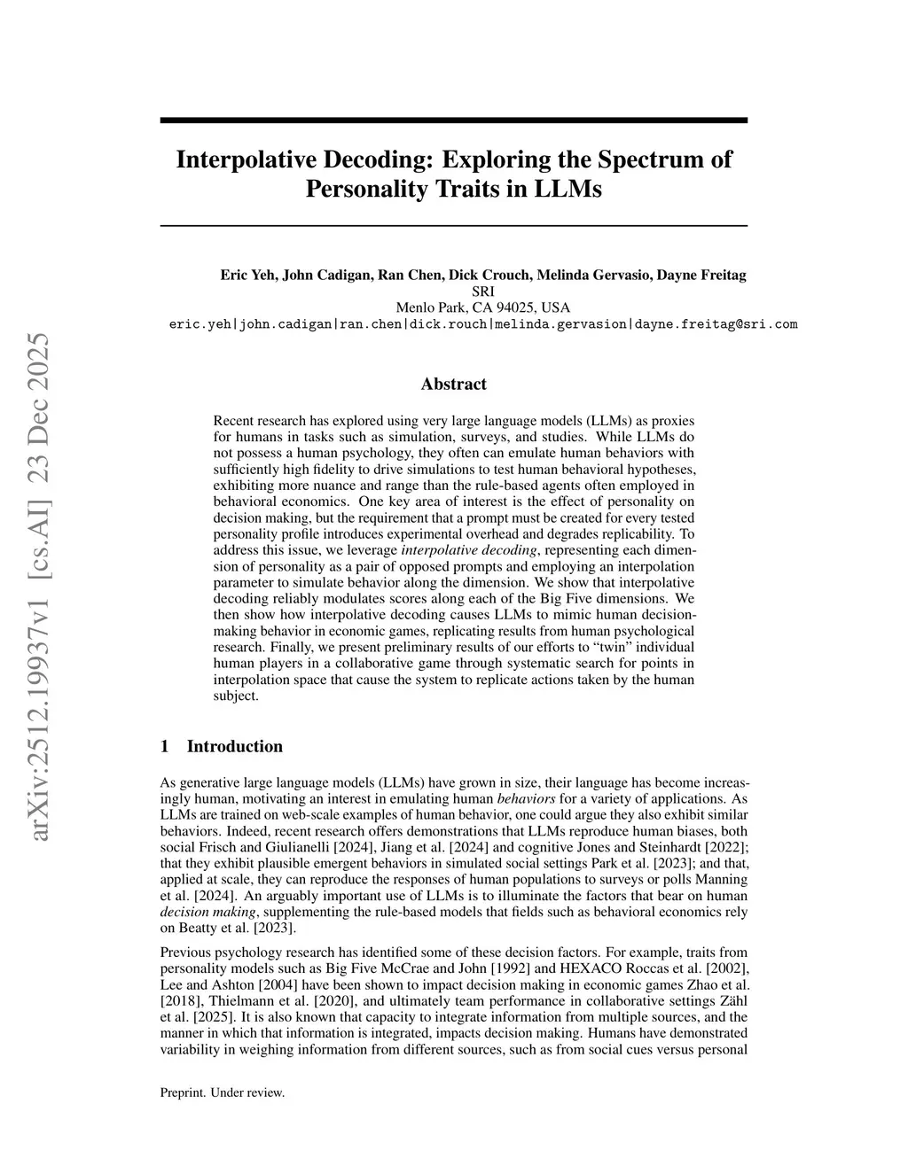 Recent research has explored using very large language models (LLMs) as proxies for humans in tasks such as simulation, surveys, and studies. While LLMs do not possess a human psychology, they often can emulate human behaviors with sufficiently high fidelity to drive simulations to test human behavioral hypotheses, exhibiting more nuance and range than the rule-based agents often employed in behavioral economics. One key area of interest is the effect of personality on decision making, but the requirement that a prompt must be created for every tested personality profile introduces experimental overhead and degrades replicability. To address this issue, we leverage interpolative decoding, representing each dimension of personality as a pair of opposed prompts and employing an interpolation parameter to simulate behavior along the dimension. We show that interpolative decoding reliably modulates scores along each of the Big Five dimensions. We then show how interpolative decoding causes LLMs to mimic human decision-making behavior in economic games, replicating results from human psychological research. Finally, we present preliminary results of our efforts to ``twin'' individual human players in a collaborative game through systematic search for points in interpolation space that cause the system to replicate actions taken by the human subject.