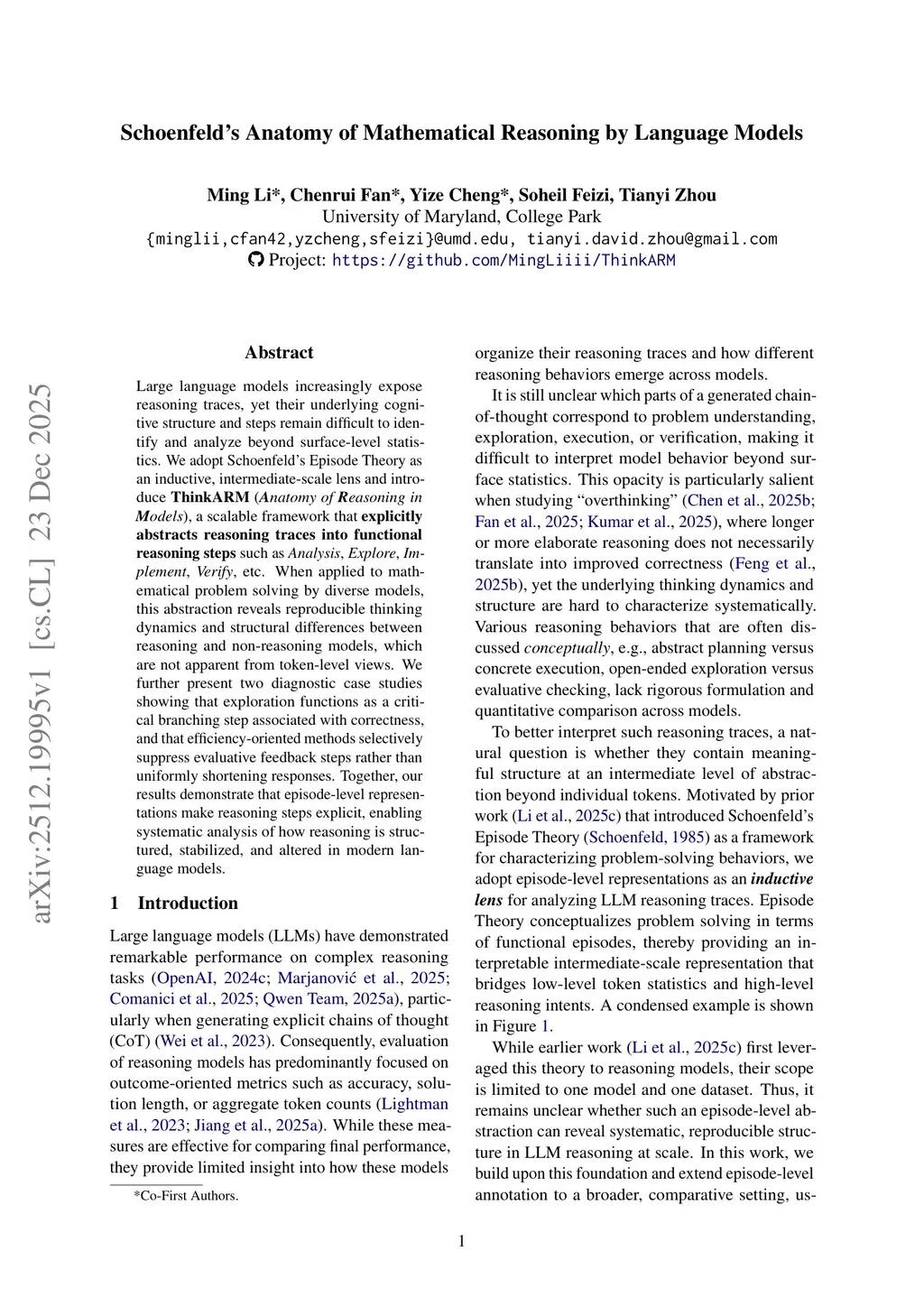 Large language models increasingly expose reasoning traces, yet their underlying cognitive structure and steps remain difficult to identify and analyze beyond surface-level statistics. We adopt Schoenfeld's Episode Theory as an inductive, intermediate-scale lens and introduce ThinkARM (Anatomy of Reasoning in Models), a scalable framework that explicitly abstracts reasoning traces into functional reasoning steps such as Analysis, Explore, Implement, Verify, etc. When applied to mathematical problem solving by diverse models, this abstraction reveals reproducible thinking dynamics and structural differences between reasoning and non-reasoning models, which are not apparent from token-level views. We further present two diagnostic case studies showing that exploration functions as a critical branching step associated with correctness, and that efficiency-oriented methods selectively suppress evaluative feedback steps rather than uniformly shortening responses. Together, our results demonstrate that episode-level representations make reasoning steps explicit, enabling systematic analysis of how reasoning is structured, stabilized, and altered in modern language models.
