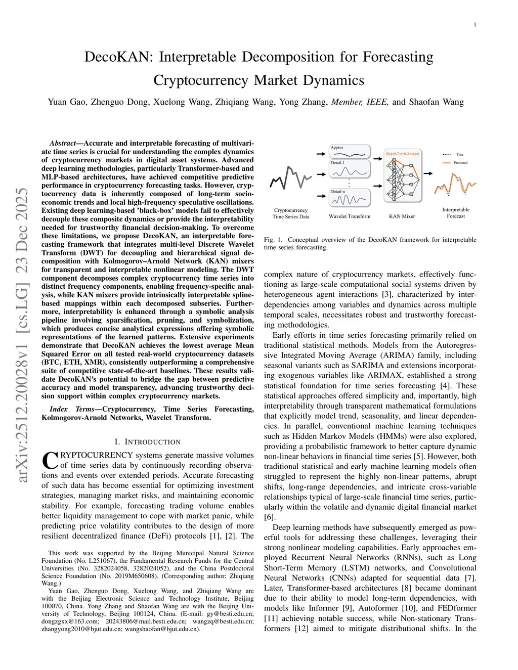 Accurate and interpretable forecasting of multivariate time series is crucial for understanding the complex dynamics of cryptocurrency markets in digital asset systems. Advanced deep learning methodologies, particularly Transformer-based and MLP-based architectures, have achieved competitive predictive performance in cryptocurrency forecasting tasks. However, cryptocurrency data is inherently composed of long-term socio-economic trends and local high-frequency speculative oscillations. Existing deep learning-based 'black-box' models fail to effectively decouple these composite dynamics or provide the interpretability needed for trustworthy financial decision-making. To overcome these limitations, we propose DecoKAN, an interpretable forecasting framework that integrates multi-level Discrete Wavelet Transform (DWT) for decoupling and hierarchical signal decomposition with Kolmogorov-Arnold Network (KAN) mixers for transparent and interpretable nonlinear modeling. The DWT component decomposes complex cryptocurrency time series into distinct frequency components, enabling frequency-specific analysis, while KAN mixers provide intrinsically interpretable spline-based mappings within each decomposed subseries. Furthermore, interpretability is enhanced through a symbolic analysis pipeline involving sparsification, pruning, and symbolization, which produces concise analytical expressions offering symbolic representations of the learned patterns. Extensive experiments demonstrate that DecoKAN achieves the lowest average Mean Squared Error on all tested real-world cryptocurrency datasets (BTC, ETH, XMR), consistently outperforming a comprehensive suite of competitive state-of-the-art baselines. These results validate DecoKAN's potential to bridge the gap between predictive accuracy and model transparency, advancing trustworthy decision support within complex cryptocurrency markets.