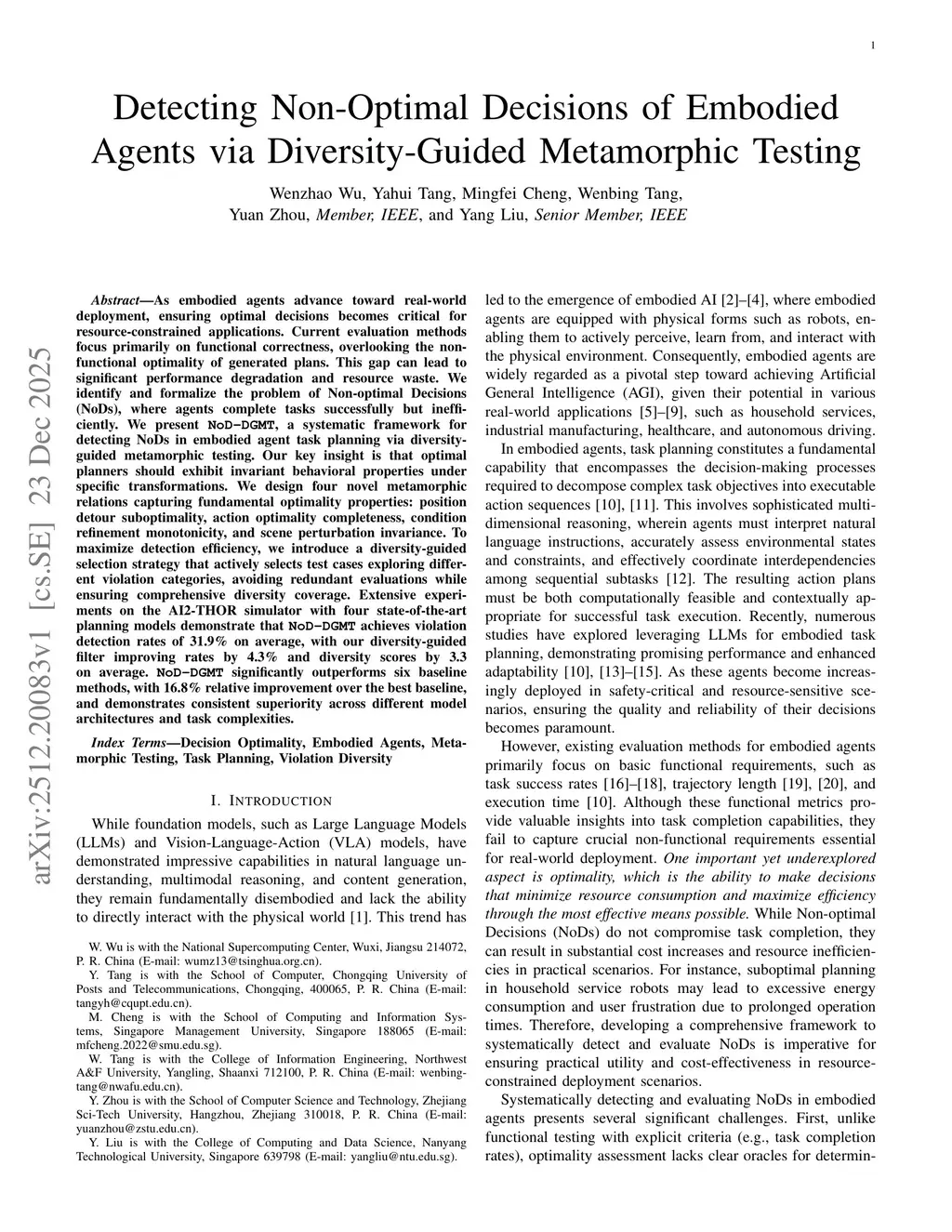 As embodied agents advance toward real-world deployment, ensuring optimal decisions becomes critical for resource-constrained applications. Current evaluation methods focus primarily on functional correctness, overlooking the non-functional optimality of generated plans. This gap can lead to significant performance degradation and resource waste. We identify and formalize the problem of Non-optimal Decisions (NoDs), where agents complete tasks successfully but inefficiently. We present NoD-DGMT, a systematic framework for detecting NoDs in embodied agent task planning via diversity-guided metamorphic testing. Our key insight is that optimal planners should exhibit invariant behavioral properties under specific transformations. We design four novel metamorphic relations capturing fundamental optimality properties: position detour suboptimality, action optimality completeness, condition refinement monotonicity, and scene perturbation invariance. To maximize detection efficiency, we introduce a diversity-guided selection strategy that actively selects test cases exploring different violation categories, avoiding redundant evaluations while ensuring comprehensive diversity coverage. Extensive experiments on the AI2-THOR simulator with four state-of-the-art planning models demonstrate that NoD-DGMT achieves violation detection rates of 31.9% on average, with our diversity-guided filter improving rates by 4.3% and diversity scores by 3.3 on average. NoD-DGMT significantly outperforms six baseline methods, with 16.8% relative improvement over the best baseline, and demonstrates consistent superiority across different model architectures and task complexities.