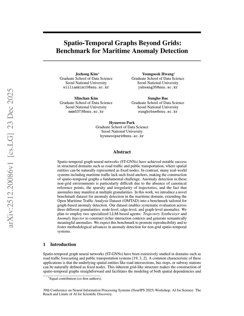 Spatio-temporal graph neural networks (ST-GNNs) have achieved notable success in structured domains such as road traffic and public transportation, where spatial entities can be naturally represented as fixed nodes. In contrast, many real-world systems including maritime traffic lack such fixed anchors, making the construction of spatio-temporal graphs a fundamental challenge. Anomaly detection in these non-grid environments is particularly difficult due to the absence of canonical reference points, the sparsity and irregularity of trajectories, and the fact that anomalies may manifest at multiple granularities. In this work, we introduce a novel benchmark dataset for anomaly detection in the maritime domain, extending the Open Maritime Traffic Analysis Dataset (OMTAD) into a benchmark tailored for graph-based anomaly detection. Our dataset enables systematic evaluation across three different granularities: node-level, edge-level, and graph-level anomalies. We plan to employ two specialized LLM-based agents: \emph{Trajectory Synthesizer} and \emph{Anomaly Injector} to construct richer interaction contexts and generate semantically meaningful anomalies. We expect this benchmark to promote reproducibility and to foster methodological advances in anomaly detection for non-grid spatio-temporal systems.