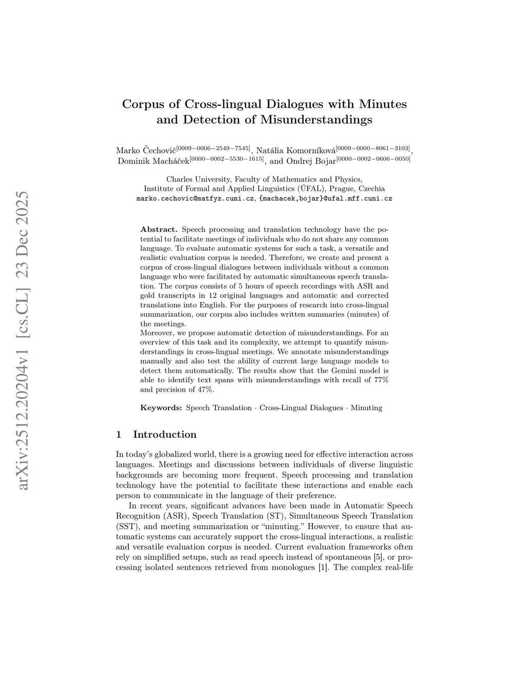 Speech processing and translation technology have the potential to facilitate meetings of individuals who do not share any common language. To evaluate automatic systems for such a task, a versatile and realistic evaluation corpus is needed. Therefore, we create and present a corpus of cross-lingual dialogues between individuals without a common language who were facilitated by automatic simultaneous speech translation. The corpus consists of 5 hours of speech recordings with ASR and gold transcripts in 12 original languages and automatic and corrected translations into English. For the purposes of research into cross-lingual summarization, our corpus also includes written summaries (minutes) of the meetings.Moreover, we propose automatic detection of misunderstandings. For an overview of this task and its complexity, we attempt to quantify misunderstandings in cross-lingual meetings. We annotate misunderstandings manually and also test the ability of current large language models to detect them automatically. The results show that the Gemini model is able to identify text spans with misunderstandings with recall of 77% and precision of 47%.