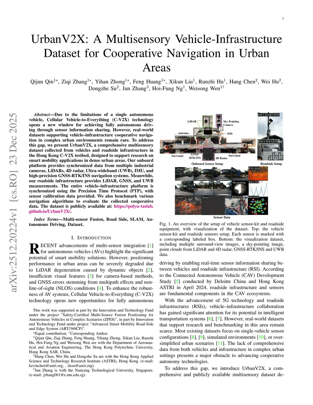 Due to the limitations of a single autonomous vehicle, Cellular Vehicle-to-Everything (C-V2X) technology opens a new window for achieving fully autonomous driving through sensor information sharing. However, real-world datasets supporting vehicle-infrastructure cooperative navigation in complex urban environments remain rare. To address this gap, we present UrbanV2X, a comprehensive multisensory dataset collected from vehicles and roadside infrastructure in the Hong Kong C-V2X testbed, designed to support research on smart mobility applications in dense urban areas. Our onboard platform provides synchronized data from multiple industrial cameras, LiDARs, 4D radar, ultra-wideband (UWB), IMU, and high-precision GNSS-RTK/INS navigation systems. Meanwhile, our roadside infrastructure provides LiDAR, GNSS, and UWB measurements. The entire vehicle-infrastructure platform is synchronized using the Precision Time Protocol (PTP), with sensor calibration data provided. We also benchmark various navigation algorithms to evaluate the collected cooperative data. The dataset is publicly available atthis https URL.