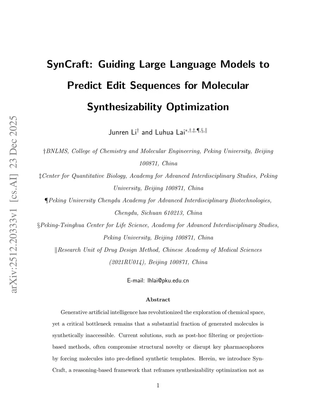 Generative artificial intelligence has revolutionized the exploration of chemical space, yet a critical bottleneck remains that a substantial fraction of generated molecules is synthetically inaccessible. Current solutions, such as post-hoc filtering or projection-based methods, often compromise structural novelty or disrupt key pharmacophores by forcing molecules into pre-defined synthetic templates. Herein, we introduce SynCraft, a reasoning-based framework that reframes synthesizability optimization not as a sequence translation task, but as a precise structural editing problem. Leveraging the emergent reasoning capabilities of Large Language Models, SynCraft navigates the "synthesis cliff" where minimal structural modifications yield significant gains in synthetic feasibility. By predicting executable sequences of atom-level edits rather than generating SMILES strings directly, SynCraft circumvents the syntactic fragility of LLMs while harnessing their chemical intuition. Extensive benchmarks demonstrate that SynCraft outperforms state-of-the-art baselines in generating synthesizable analogs with high structural fidelity. Furthermore, through interaction-aware prompting, SynCraft successfully replicates expert medicinal chemistry intuition in editing PLK1 inhibitors and rescuing high-scoring but previously discarded RIPK1 candidates in previous molecular generation literatures.