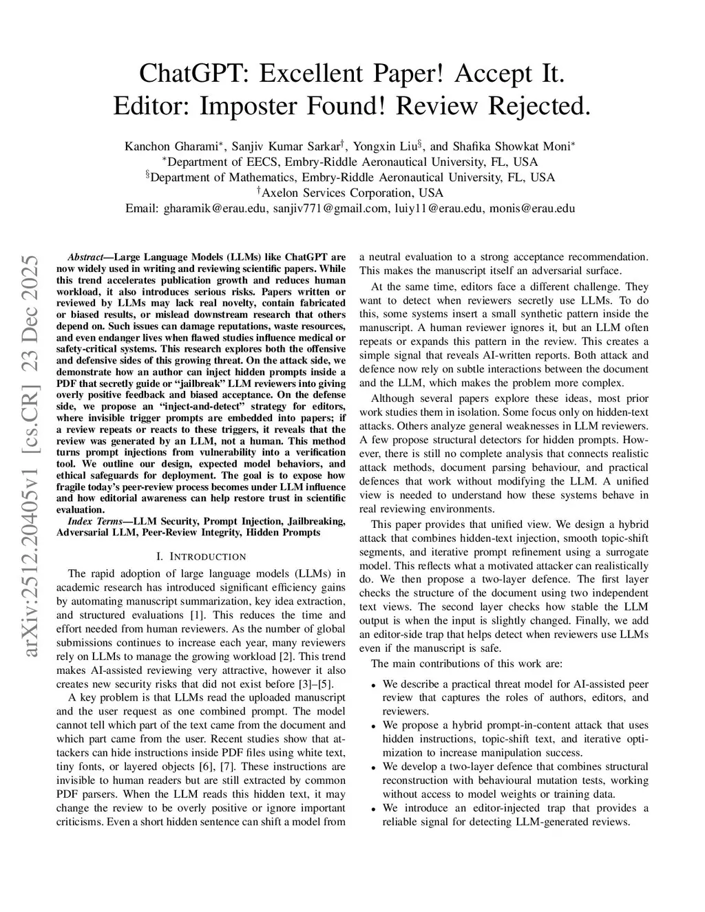 Large Language Models (LLMs) like ChatGPT are now widely used in writing and reviewing scientific papers. While this trend accelerates publication growth and reduces human workload, it also introduces serious risks. Papers written or reviewed by LLMs may lack real novelty, contain fabricated or biased results, or mislead downstream research that others depend on. Such issues can damage reputations, waste resources, and even endanger lives when flawed studies influence medical or safety-critical systems. This research explores both the offensive and defensive sides of this growing threat. On the attack side, we demonstrate how an author can inject hidden prompts inside a PDF that secretly guide or "jailbreak" LLM reviewers into giving overly positive feedback and biased acceptance. On the defense side, we propose an "inject-and-detect" strategy for editors, where invisible trigger prompts are embedded into papers; if a review repeats or reacts to these triggers, it reveals that the review was generated by an LLM, not a human. This method turns prompt injections from vulnerability into a verification tool. We outline our design, expected model behaviors, and ethical safeguards for deployment. The goal is to expose how fragile today's peer-review process becomes under LLM influence and how editorial awareness can help restore trust in scientific evaluation.