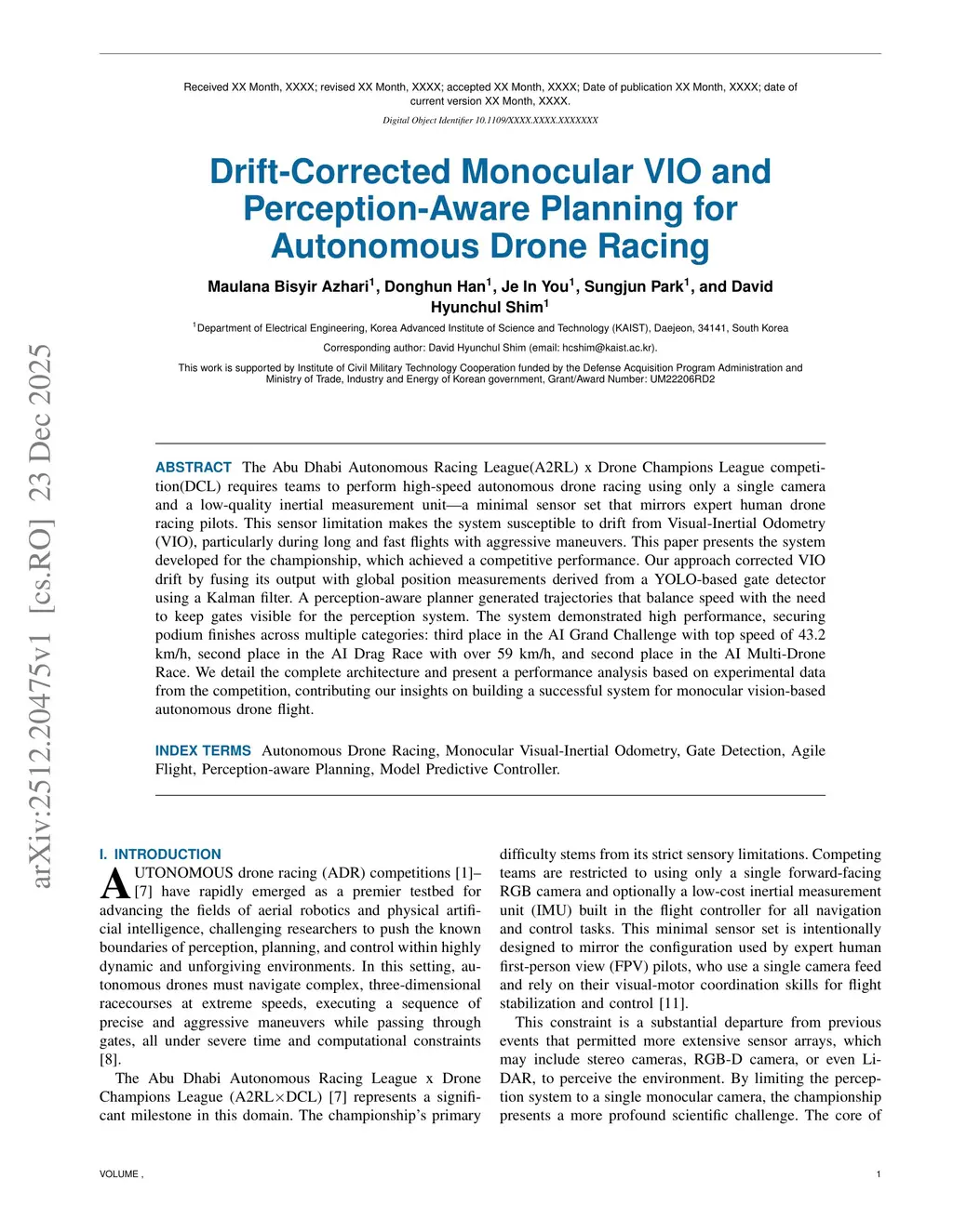 The Abu Dhabi Autonomous Racing League(A2RL) x Drone Champions League competition(DCL) requires teams to perform high-speed autonomous drone racing using only a single camera and a low-quality inertial measurement unit -- a minimal sensor set that mirrors expert human drone racing pilots. This sensor limitation makes the system susceptible to drift from Visual-Inertial Odometry (VIO), particularly during long and fast flights with aggressive maneuvers. This paper presents the system developed for the championship, which achieved a competitive performance. Our approach corrected VIO drift by fusing its output with global position measurements derived from a YOLO-based gate detector using a Kalman filter. A perception-aware planner generated trajectories that balance speed with the need to keep gates visible for the perception system. The system demonstrated high performance, securing podium finishes across multiple categories: third place in the AI Grand Challenge with top speed of 43.2 km/h, second place in the AI Drag Race with over 59 km/h, and second place in the AI Multi-Drone Race. We detail the complete architecture and present a performance analysis based on experimental data from the competition, contributing our insights on building a successful system for monocular vision-based autonomous drone flight.