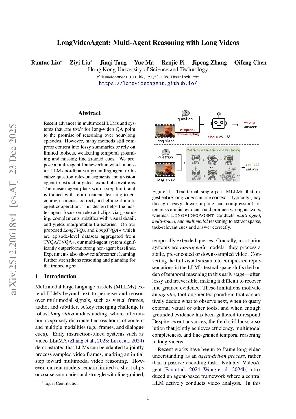 Recent advances in multimodal LLMs and systems that use tools for long-video QA point to the promise of reasoning over hour-long episodes. However, many methods still compress content into lossy summaries or rely on limited toolsets, weakening temporal grounding and missing fine-grained cues. We propose a multi-agent framework in which a master LLM coordinates a grounding agent to localize question-relevant segments and a vision agent to extract targeted textual observations. The master agent plans with a step limit, and is trained with reinforcement learning to encourage concise, correct, and efficient multi-agent cooperation. This design helps the master agent focus on relevant clips via grounding, complements subtitles with visual detail, and yields interpretable trajectories. On our proposed LongTVQA and LongTVQA+ which are episode-level datasets aggregated from TVQA/TVQA+, our multi-agent system significantly outperforms strong non-agent baselines. Experiments also show reinforcement learning further strengthens reasoning and planning for the trained agent. Code and data will be shared atthis https URL.