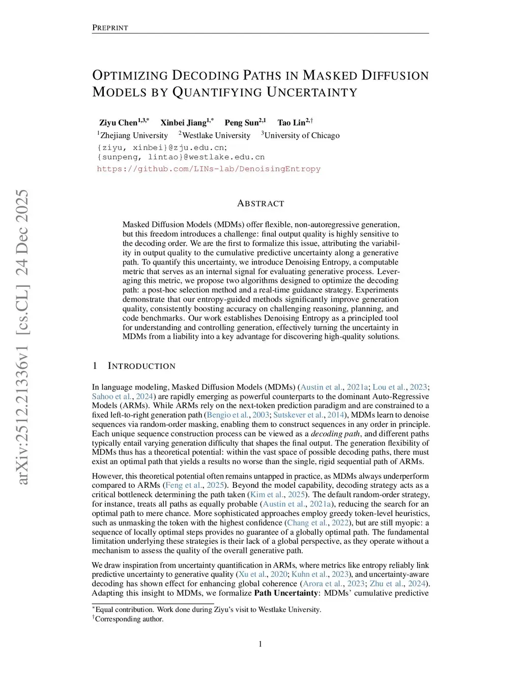Masked Diffusion Models (MDMs) offer flexible, non-autoregressive generation, but this freedom introduces a challenge: final output quality is highly sensitive to the decoding order. We are the first to formalize this issue, attributing the variability in output quality to the cumulative predictive uncertainty along a generative path. To quantify this uncertainty, we introduce Denoising Entropy, a computable metric that serves as an internal signal for evaluating generative process. Leveraging this metric, we propose two algorithms designed to optimize the decoding path: a post-hoc selection method and a real-time guidance strategy. Experiments demonstrate that our entropy-guided methods significantly improve generation quality, consistently boosting accuracy on challenging reasoning, planning, and code benchmarks. Our work establishes Denoising Entropy as a principled tool for understanding and controlling generation, effectively turning the uncertainty in MDMs from a liability into a key advantage for discovering high-quality solutions.