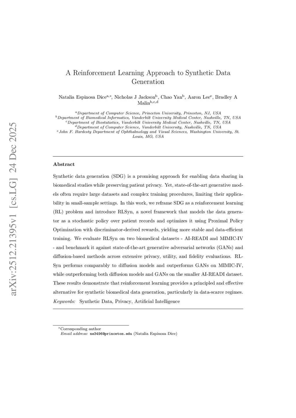 Synthetic data generation (SDG) is a promising approach for enabling data sharing in biomedical studies while preserving patient privacy. Yet, state-of-the-art generative models often require large datasets and complex training procedures, limiting their applicability in small-sample settings common in biomedical research. This study aims to develop a more principled and efficient approach to SDG and evaluate its efficacy for biomedical applications. In this work, we reframe SDG as a reinforcement learning (RL) problem and introduce RLSyn, a novel framework that models the data generator as a stochastic policy over patient records and optimizes it using Proximal Policy Optimization with discriminator-derived rewards. We evaluate RLSyn on two biomedical datasets--AI-READI and MIMIC-IV--and benchmark it against state-of-the-art generative adversarial networks (GANs) and diffusion-based methods across extensive privacy, utility, and fidelity evaluations. On MIMIC-IV, RLSyn achieves predictive utility comparable to diffusion models (S2R AUC 0.902 vs 0.906 respectively) while slightly outperforming them in fidelity (NMI 0.001 vs. 0.003; DWD 2.073 vs. 2.797) and achieving comparable, low privacy risk (~0.50 membership inference risk AUC). On the smaller AI-READI dataset, RLSyn again matches diffusion-based utility (S2R AUC 0.873 vs. 0.871), while achieving higher fidelity (NMI 0.001 vs. 0.002; DWD 13.352 vs. 16.441) and significantly lower vulnerability to membership inference attacks (AUC 0.544 vs. 0.601). Both RLSyn and diffusion-based models substantially outperform GANs across utility and fidelity on both datasets. Our results suggest that reinforcement learning provides a principled and effective approach for synthetic biomedical data generation, particularly in data-scarce regimes.