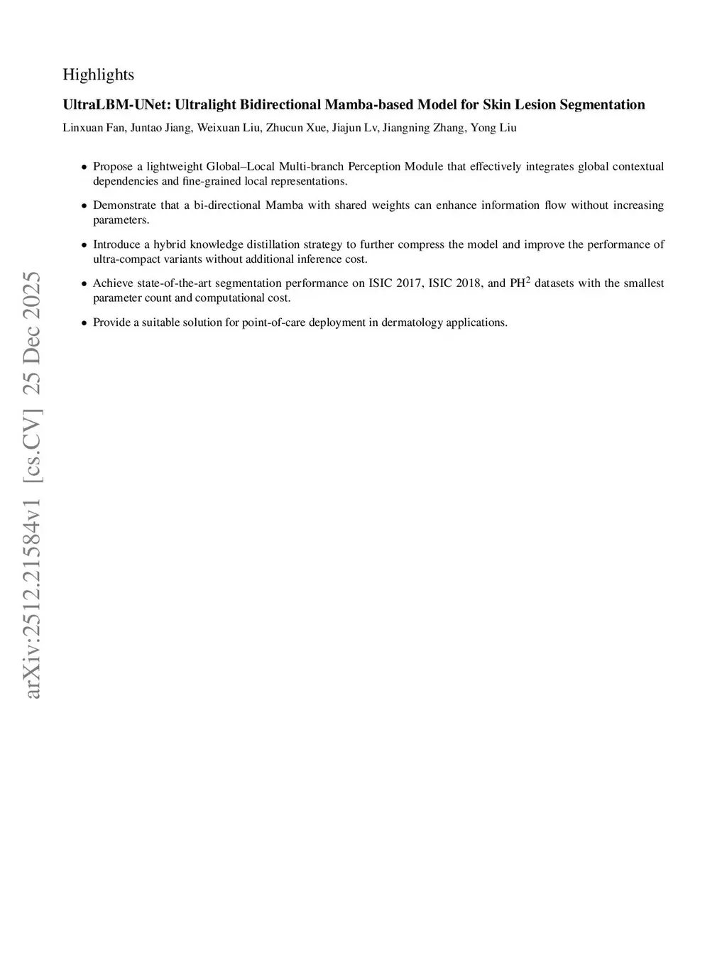 Skin lesion segmentation is a crucial step in dermatology for guiding clinical decision-making. However, existing methods for accurate, robust, and resource-efficient lesion analysis have limitations, including low performance and high computational complexity. To address these limitations, we propose UltraLBM-UNet, a lightweight U-Net variant that integrates a bidirectional Mamba-based global modeling mechanism with multi-branch local feature perception. The proposed architecture integrates efficient local feature injection with bidirectional state-space modeling, enabling richer contextual interaction across spatial dimensions while maintaining computational compactness suitable for point-of-care deployment. Extensive experiments on the ISIC 2017, ISIC 2018, and PH2 datasets demonstrate that our model consistently achieves state-of-the-art segmentation accuracy, outperforming existing lightweight and Mamba counterparts with only 0.034M parameters and 0.060 GFLOPs. In addition, we introduce a hybrid knowledge distillation strategy to train an ultra-compact student model, where the distilled variant UltraLBM-UNet-T, with only 0.011M parameters and 0.019 GFLOPs, achieves competitive segmentation performance. These results highlight the suitability of UltraLBM-UNet for point-of-care deployment, where accurate and robust lesion analyses are essential. The source code is publicly available atthis https URL.