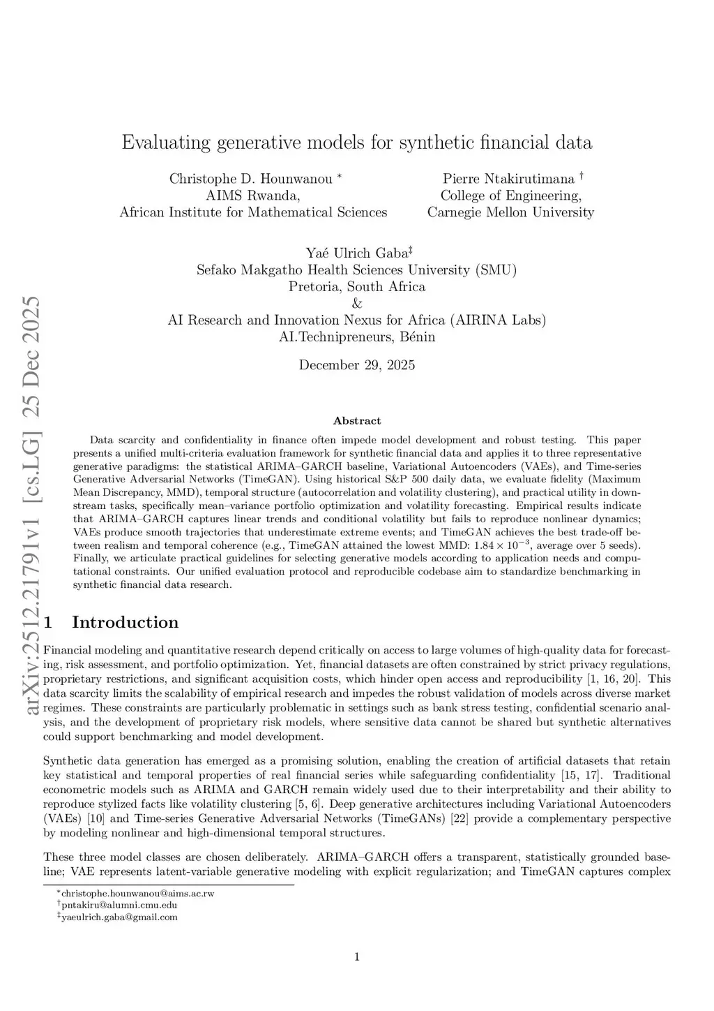 Data scarcity and confidentiality in finance often impede model development and robust testing. This paper presents a unified multi-criteria evaluation framework for synthetic financial data and applies it to three representative generative paradigms: the statistical ARIMA-GARCH baseline, Variational Autoencoders (VAEs), and Time-series Generative Adversarial Networks (TimeGAN). Using historical S and P 500 daily data, we evaluate fidelity (Maximum Mean Discrepancy, MMD), temporal structure (autocorrelation and volatility clustering), and practical utility in downstream tasks, specifically mean-variance portfolio optimization and volatility forecasting. Empirical results indicate that ARIMA-GARCH captures linear trends and conditional volatility but fails to reproduce nonlinear dynamics; VAEs produce smooth trajectories that underestimate extreme events; and TimeGAN achieves the best trade-off between realism and temporal coherence (e.g., TimeGAN attained the lowest MMD: 1.84e-3, average over 5 seeds). Finally, we articulate practical guidelines for selecting generative models according to application needs and computational constraints. Our unified evaluation protocol and reproducible codebase aim to standardize benchmarking in synthetic financial data research.