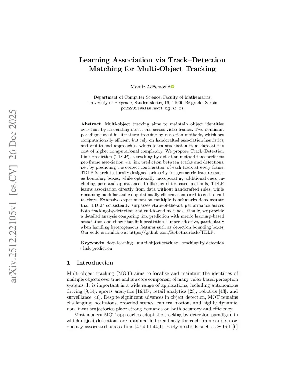 Multi-object tracking aims to maintain object identities over time by associating detections across video frames. Two dominant paradigms exist in literature: tracking-by-detection methods, which are computationally efficient but rely on handcrafted association heuristics, and end-to-end approaches, which learn association from data at the cost of higher computational complexity. We propose Track-Detection Link Prediction (TDLP), a tracking-by-detection method that performs per-frame association via link prediction between tracks and detections, i.e., by predicting the correct continuation of each track at every frame. TDLP is architecturally designed primarily for geometric features such as bounding boxes, while optionally incorporating additional cues, including pose and appearance. Unlike heuristic-based methods, TDLP learns association directly from data without handcrafted rules, while remaining modular and computationally efficient compared to end-to-end trackers. Extensive experiments on multiple benchmarks demonstrate that TDLP consistently surpasses state-of-the-art performance across both tracking-by-detection and end-to-end methods. Finally, we provide a detailed analysis comparing link prediction with metric learning-based association and show that link prediction is more effective, particularly when handling heterogeneous features such as detection bounding boxes. Our code is available at \href{this https URL}{this https URL}.