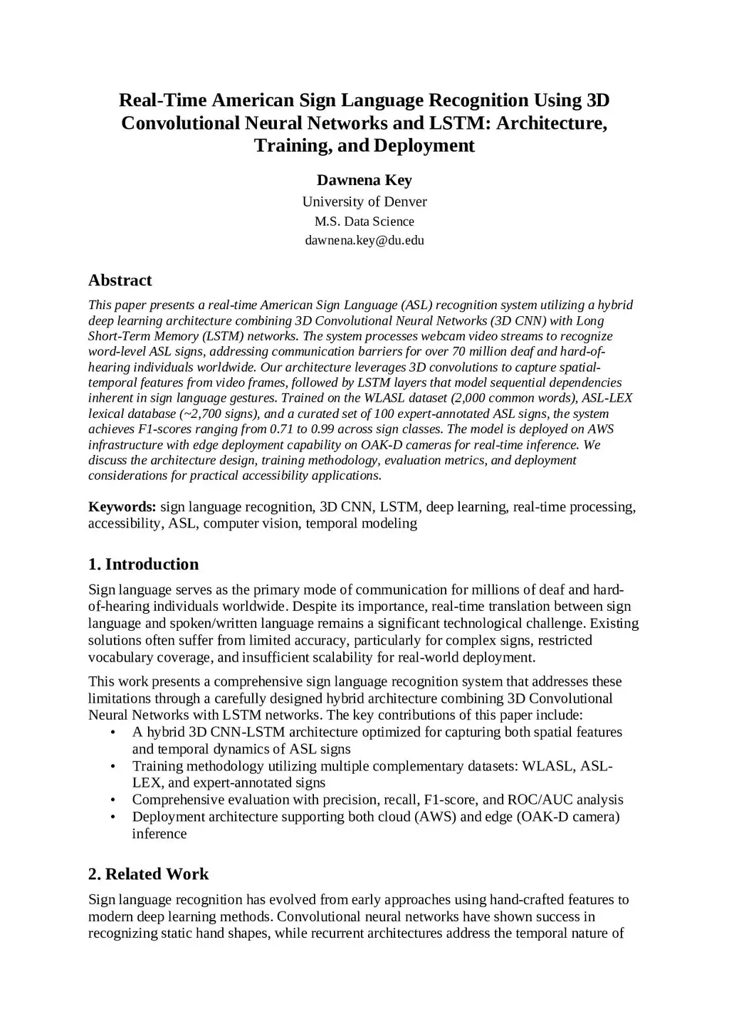 This paper presents a real-time American Sign Language (ASL) recognition system utilizing a hybrid deep learning architecture combining 3D Convolutional Neural Networks (3D CNN) with Long Short-Term Memory (LSTM) networks. The system processes webcam video streams to recognize word-level ASL signs, addressing communication barriers for over 70 million deaf and hard-of-hearing individuals worldwide. Our architecture leverages 3D convolutions to capture spatial-temporal features from video frames, followed by LSTM layers that model sequential dependencies inherent in sign language gestures. Trained on the WLASL dataset (2,000 common words), ASL-LEX lexical database (~2,700 signs), and a curated set of 100 expert-annotated ASL signs, the system achieves F1-scores ranging from 0.71 to 0.99 across sign classes. The model is deployed on AWS infrastructure with edge deployment capability on OAK-D cameras for real-time inference. We discuss the architecture design, training methodology, evaluation metrics, and deployment considerations for practical accessibility applications.