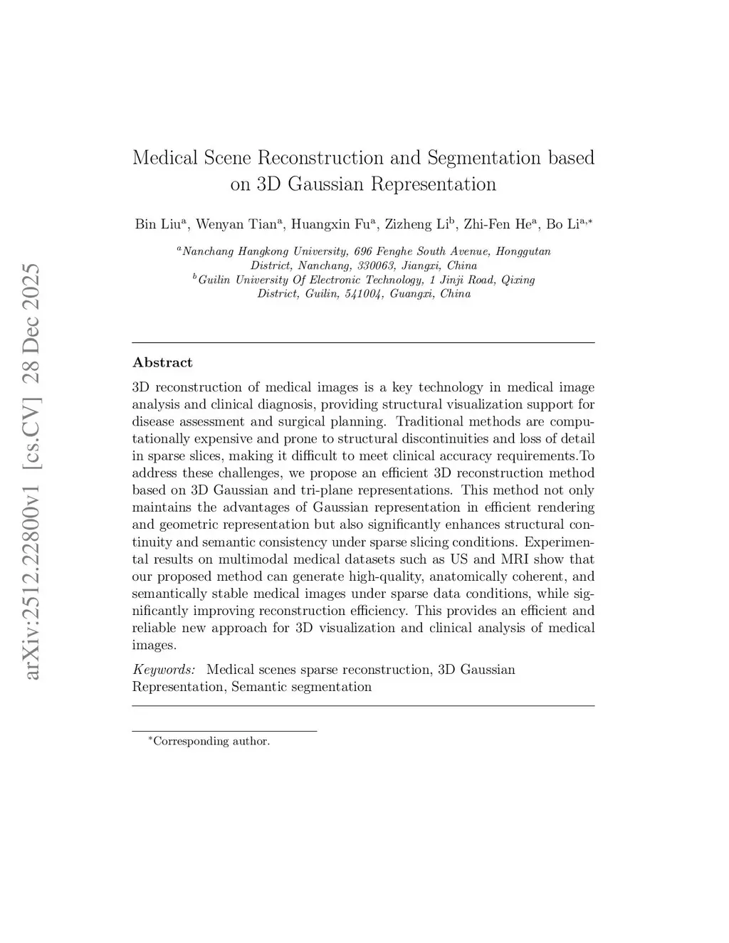 3D reconstruction of medical images is a key technology in medical image analysis and clinical diagnosis, providing structural visualization support for disease assessment and surgical planning. Traditional methods are computationally expensive and prone to structural discontinuities and loss of detail in sparse slices, making it difficult to meet clinical accuracythis http URLaddress these challenges, we propose an efficient 3D reconstruction method based on 3D Gaussian and tri-plane representations. This method not only maintains the advantages of Gaussian representation in efficient rendering and geometric representation but also significantly enhances structural continuity and semantic consistency under sparse slicing conditions. Experimental results on multimodal medical datasets such as US and MRI show that our proposed method can generate high-quality, anatomically coherent, and semantically stable medical images under sparse data conditions, while significantly improving reconstruction efficiency. This provides an efficient and reliable new approach for 3D visualization and clinical analysis of medical images.
