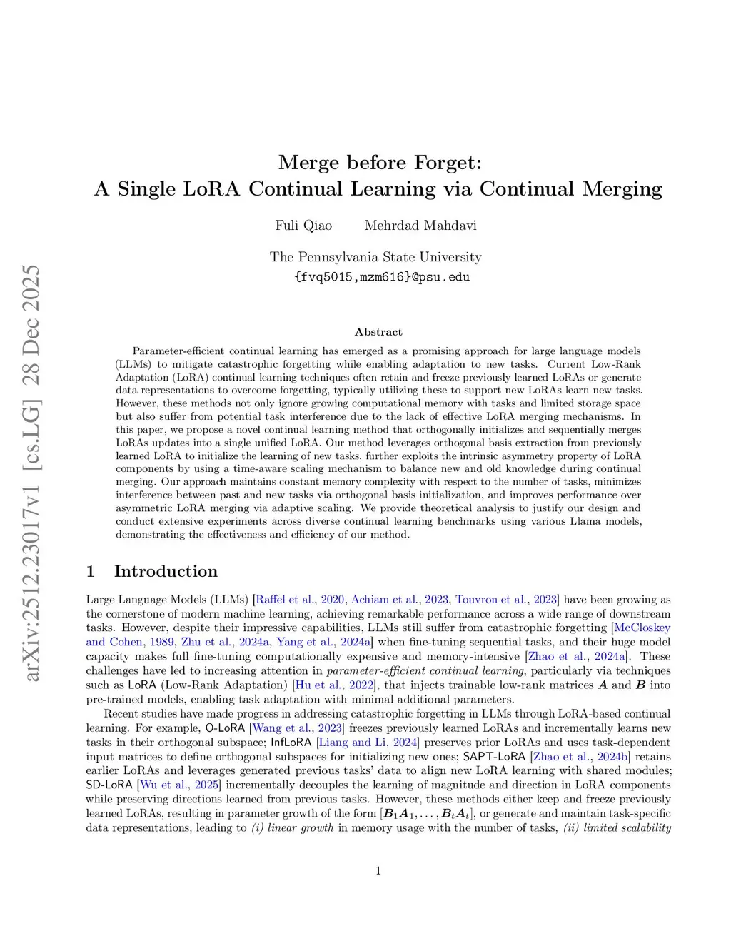 Parameter-efficient continual learning has emerged as a promising approach for large language models (LLMs) to mitigate catastrophic forgetting while enabling adaptation to new tasks. Current Low-Rank Adaptation (LoRA) continual learning techniques often retain and freeze previously learned LoRAs or generate data representations to overcome forgetting, typically utilizing these to support new LoRAs learn new tasks. However, these methods not only ignore growing computational memory with tasks and limited storage space but also suffer from potential task interference due to the lack of effective LoRA merging mechanisms. In this paper, we propose a novel continual learning method that orthogonally initializes and sequentially merges LoRAs updates into a single unified LoRA. Our method leverages orthogonal basis extraction from previously learned LoRA to initialize the learning of new tasks, further exploits the intrinsic asymmetry property of LoRA components by using a time-aware scaling mechanism to balance new and old knowledge during continual merging. Our approach maintains constant memory complexity with respect to the number of tasks, minimizes interference between past and new tasks via orthogonal basis initialization, and improves performance over asymmetric LoRA merging via adaptive scaling. We provide theoretical analysis to justify our design and conduct extensive experiments across diverse continual learning benchmarks using various Llama models, demonstrating the effectiveness and efficiency of our method.