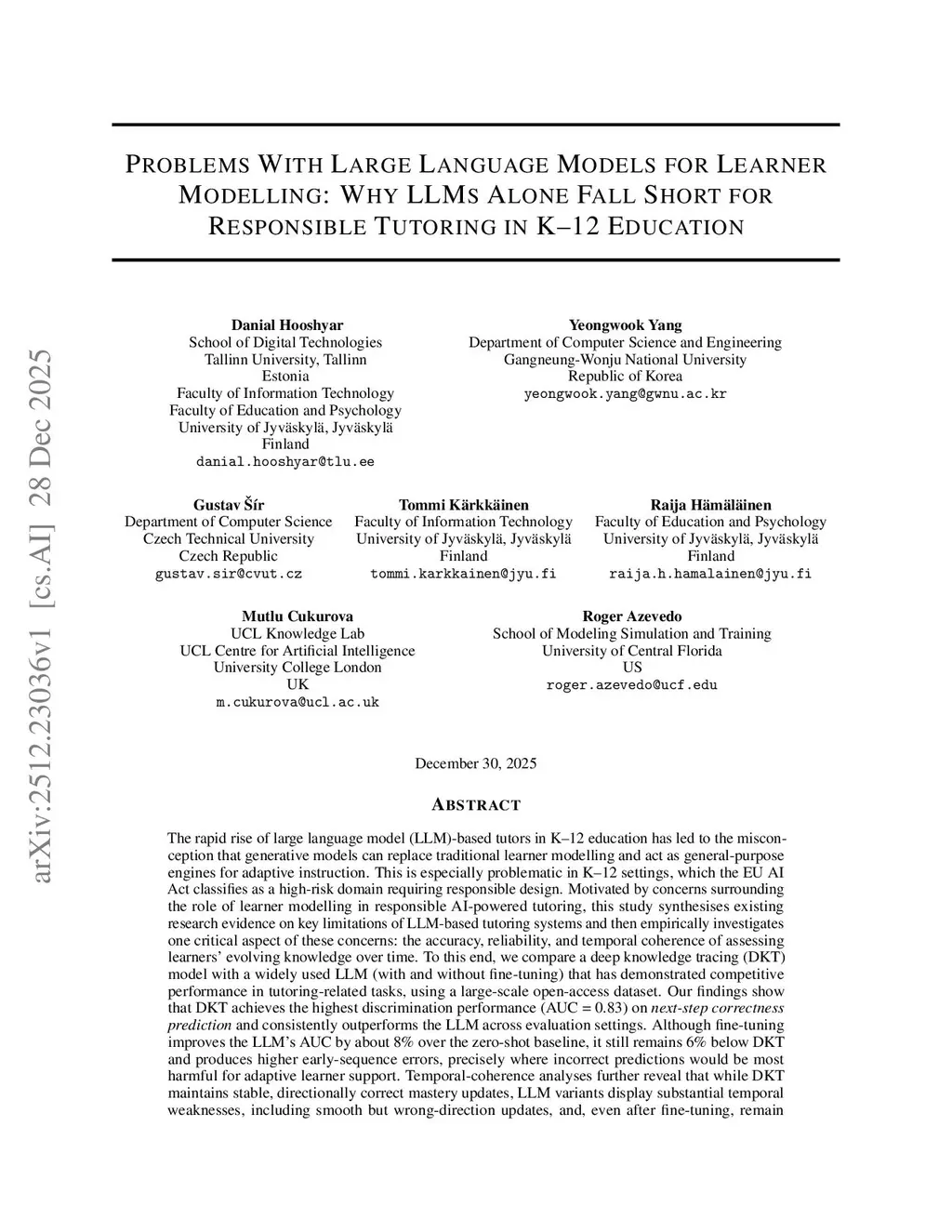 Problems With Large Language Models for Learner Modelling: Why LLMs Alone Fall Short for Responsible Tutoring in K--12 Education