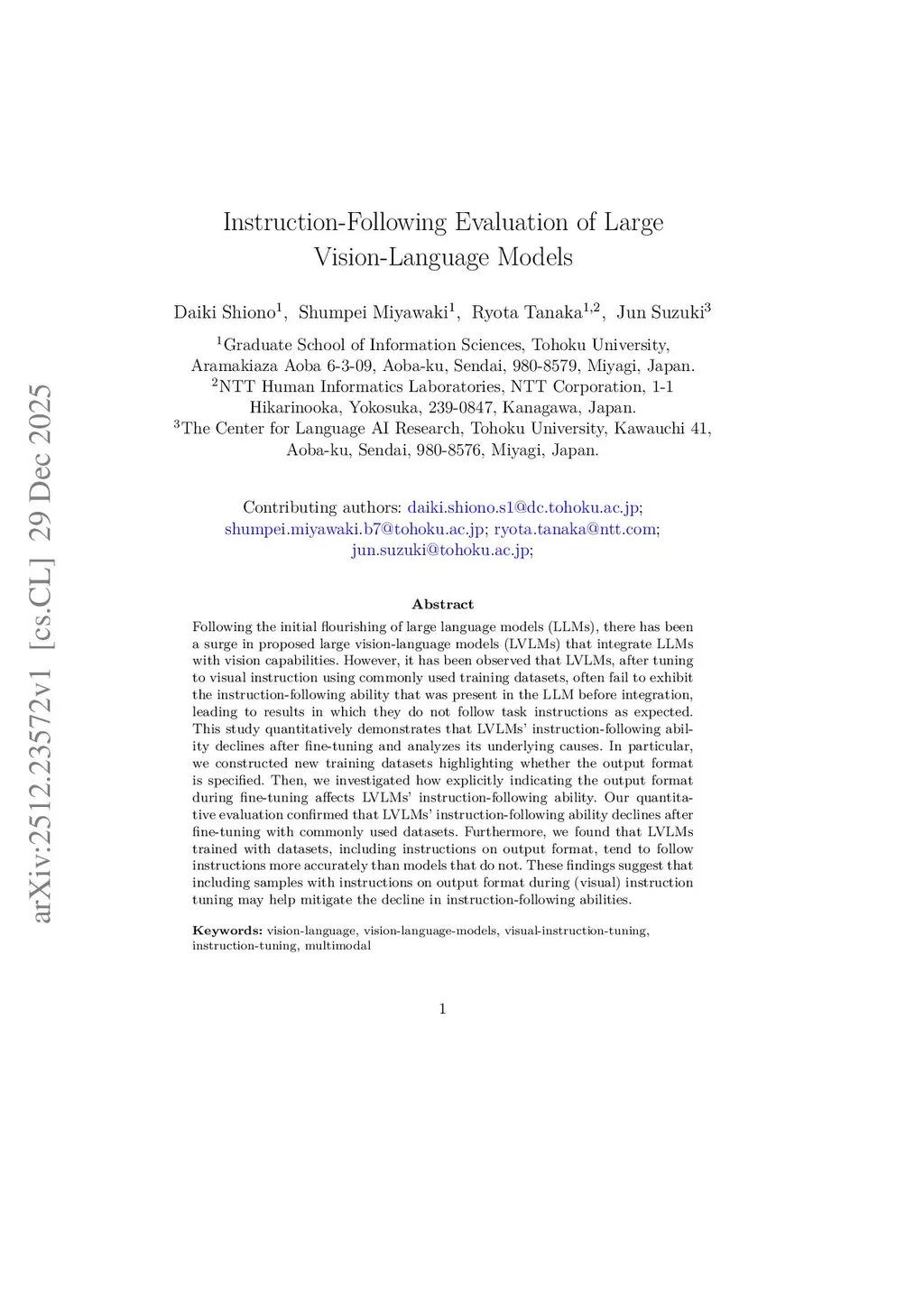 Following the initial flourishing of large language models (LLMs), there has been a surge in proposed large vision-language models (LVLMs) that integrate LLMs with vision capabilities. However, it has been observed that LVLMs, after tuning to visual instruction using commonly used training datasets, often fail to exhibit the instruction-following ability that was present in the LLM before integration, leading to results in which they do not follow task instructions as expected. This study quantitatively demonstrates that LVLMs' instruction-following ability declines after fine-tuning and analyzes its underlying causes. In particular, we constructed new training datasets highlighting whether the output format is specified. Then, we investigated how explicitly indicating the output format during fine-tuning affects LVLMs' instruction-following ability. Our quantitative evaluation confirmed that LVLMs' instruction-following ability declines after fine-tuning with commonly used datasets. Furthermore, we found that LVLMs trained with datasets, including instructions on output format, tend to follow instructions more accurately than models that do not. These findings suggest that including samples with instructions on output format during (visual) instruction tuning may help mitigate the decline in instruction-following abilities.
