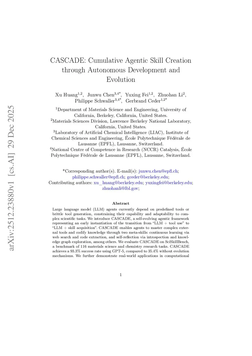 Large language model (LLM) agents currently depend on predefined tools or early-stage tool generation, limiting their adaptability and scalability to complex scientific tasks. We introduce CASCADE, a self-evolving agentic framework representing an early instantiation of the transition from "LLM + tool use" to "LLM + skill acquisition". CASCADE enables agents to master complex external tools and codify knowledge through two meta-skills: continuous learning via web search, code extraction, and memory utilization; self-reflection via introspection, knowledge graph exploration, and others. We evaluate CASCADE on SciSkillBench, a benchmark of 116 materials science and chemistry research tasks. CASCADE achieves a 93.3% success rate using GPT-5, compared to 35.4% without evolution mechanisms. We further demonstrate real-world applications in computational analysis, autonomous laboratory experiments, and selective reproduction of published papers. Along with human-agent collaboration and memory consolidation, CASCADE accumulates executable skills that can be shared across agents and scientists, moving toward scalable AI-assisted scientific research.