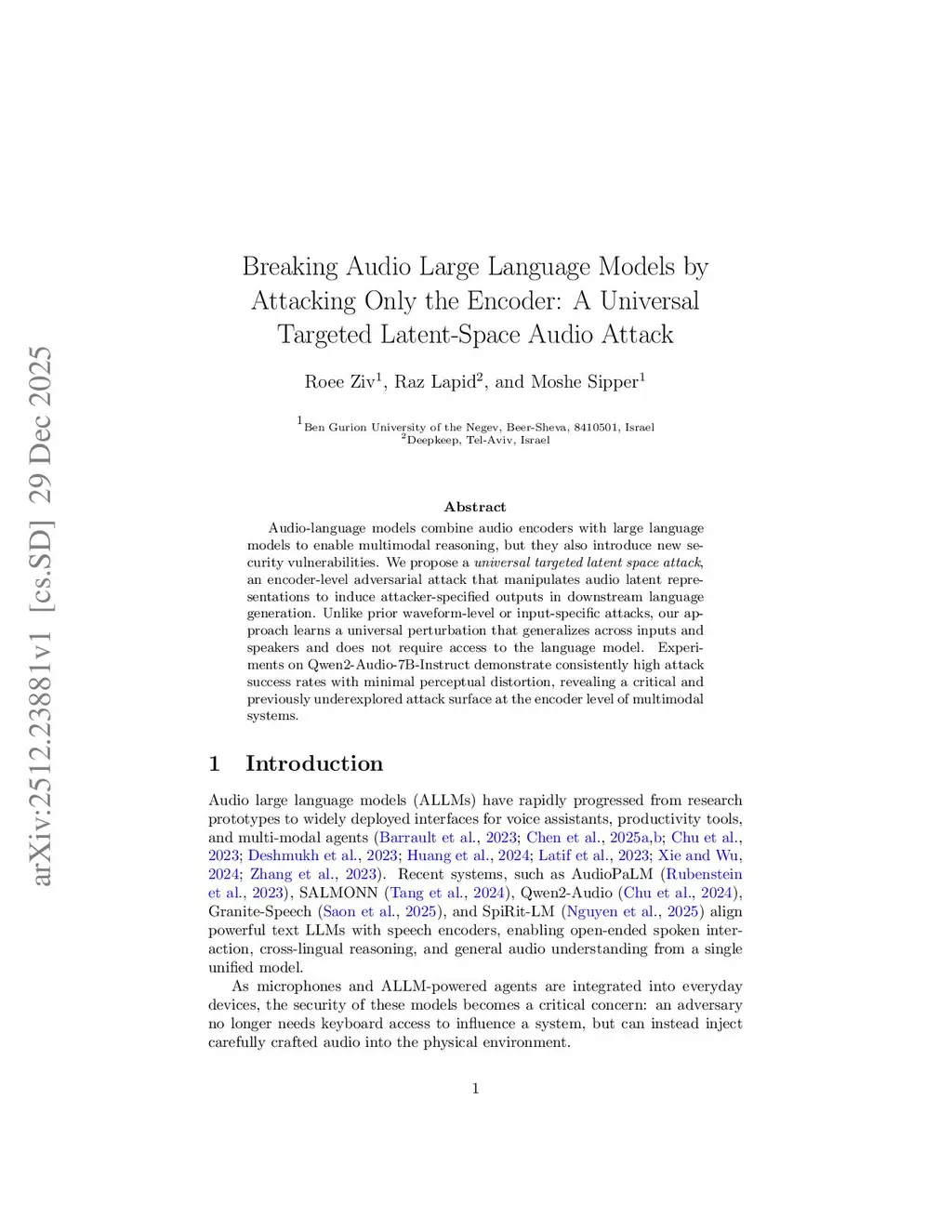 Audio-language models combine audio encoders with large language models to enable multimodal reasoning, but they also introduce new security vulnerabilities. We propose a universal targeted latent space attack, an encoder-level adversarial attack that manipulates audio latent representations to induce attacker-specified outputs in downstream language generation. Unlike prior waveform-level or input-specific attacks, our approach learns a universal perturbation that generalizes across inputs and speakers and does not require access to the language model. Experiments on Qwen2-Audio-7B-Instruct demonstrate consistently high attack success rates with minimal perceptual distortion, revealing a critical and previously underexplored attack surface at the encoder level of multimodal systems.