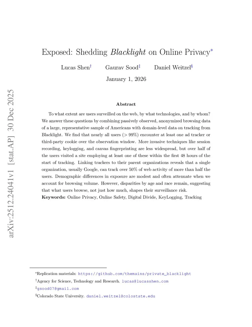 To what extent are users surveilled on the web, by what technologies, and by whom? We answer these questions by combining passively observed, anonymized browsing data of a large, representative sample of Americans with domain-level data on tracking from Blacklight. We find that nearly all users ($ > 99\%$) encounter at least one ad tracker or third-party cookie over the observation window. More invasive techniques like session recording, keylogging, and canvas fingerprinting are less widespread, but over half of the users visited a site employing at least one of these within the first 48 hours of the start of tracking. Linking trackers to their parent organizations reveals that a single organization, usually Google, can track over of web activity of more than half the users. Demographic differences in exposure are modest and often attenuate when we account for browsing volume. However, disparities by age and race remain, suggesting that what users browse, not just how much, shapes their surveillance risk.