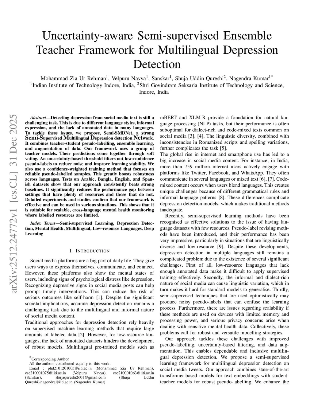 Uncertainty-aware Semi-supervised Ensemble Teacher Framework for Multilingual Depression Detection