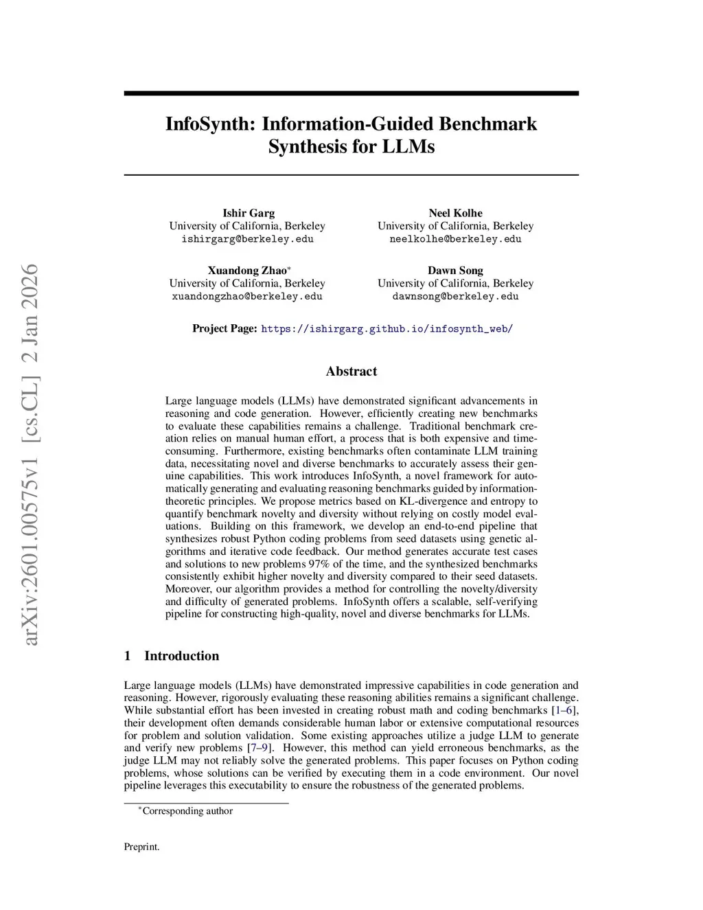 Large language models (LLMs) have demonstrated significant advancements in reasoning and code generation. However, efficiently creating new benchmarks to evaluate these capabilities remains a challenge. Traditional benchmark creation relies on manual human effort, a process that is both expensive and time-consuming. Furthermore, existing benchmarks often contaminate LLM training data, necessitating novel and diverse benchmarks to accurately assess their genuine capabilities. This work introduces InfoSynth, a novel framework for automatically generating and evaluating reasoning benchmarks guided by information-theoretic principles. We propose metrics based on KL-divergence and entropy to quantify benchmark novelty and diversity without relying on costly model evaluations. Building on this framework, we develop an end-to-end pipeline that synthesizes robust Python coding problems from seed datasets using genetic algorithms and iterative code feedback. Our method generates accurate test cases and solutions to new problems 97% of the time, and the synthesized benchmarks consistently exhibit higher novelty and diversity compared to their seed datasets. Moreover, our algorithm provides a method for controlling the novelty/diversity and difficulty of generated problems. InfoSynth offers a scalable, self-verifying pipeline for constructing high-quality, novel and diverse benchmarks for LLMs. Project Page:this https URL
