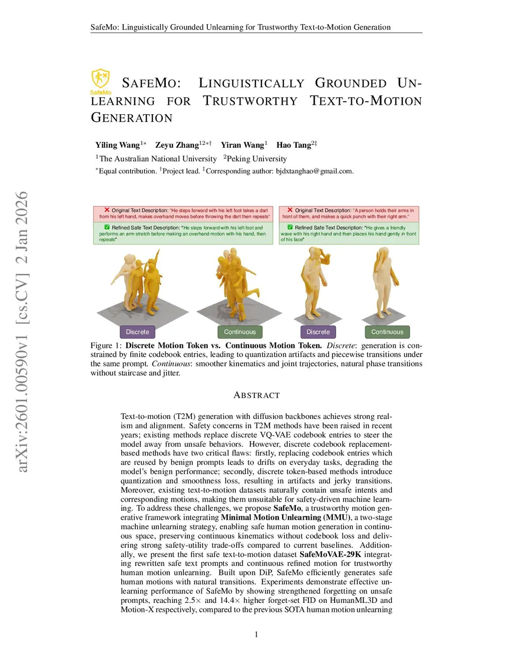 Text-to-motion (T2M) generation with diffusion backbones achieves strong realism and alignment. Safety concerns in T2M methods have been raised in recent years; existing methods replace discrete VQ-VAE codebook entries to steer the model away from unsafe behaviors. However, discrete codebook replacement-based methods have two critical flaws: firstly, replacing codebook entries which are reused by benign prompts leads to drifts on everyday tasks, degrading the model's benign performance; secondly, discrete token-based methods introduce quantization and smoothness loss, resulting in artifacts and jerky transitions. Moreover, existing text-to-motion datasets naturally contain unsafe intents and corresponding motions, making them unsuitable for safety-driven machine learning. To address these challenges, we propose SafeMo, a trustworthy motion generative framework integrating Minimal Motion Unlearning (MMU), a two-stage machine unlearning strategy, enabling safe human motion generation in continuous space, preserving continuous kinematics without codebook loss and delivering strong safety-utility trade-offs compared to current baselines. Additionally, we present the first safe text-to-motion dataset SafeMoVAE-29K integrating rewritten safe text prompts and continuous refined motion for trustworthy human motion unlearning. Built upon DiP, SafeMo efficiently generates safe human motions with natural transitions. Experiments demonstrate effective unlearning performance of SafeMo by showing strengthened forgetting on unsafe prompts, reaching 2.5x and 14.4x higher forget-set FID on HumanML3D and Motion-X respectively, compared to the previous SOTA human motion unlearning method LCR, with benign performance on safe prompts being better or comparable. Code:this https URL. Website:this https URL.