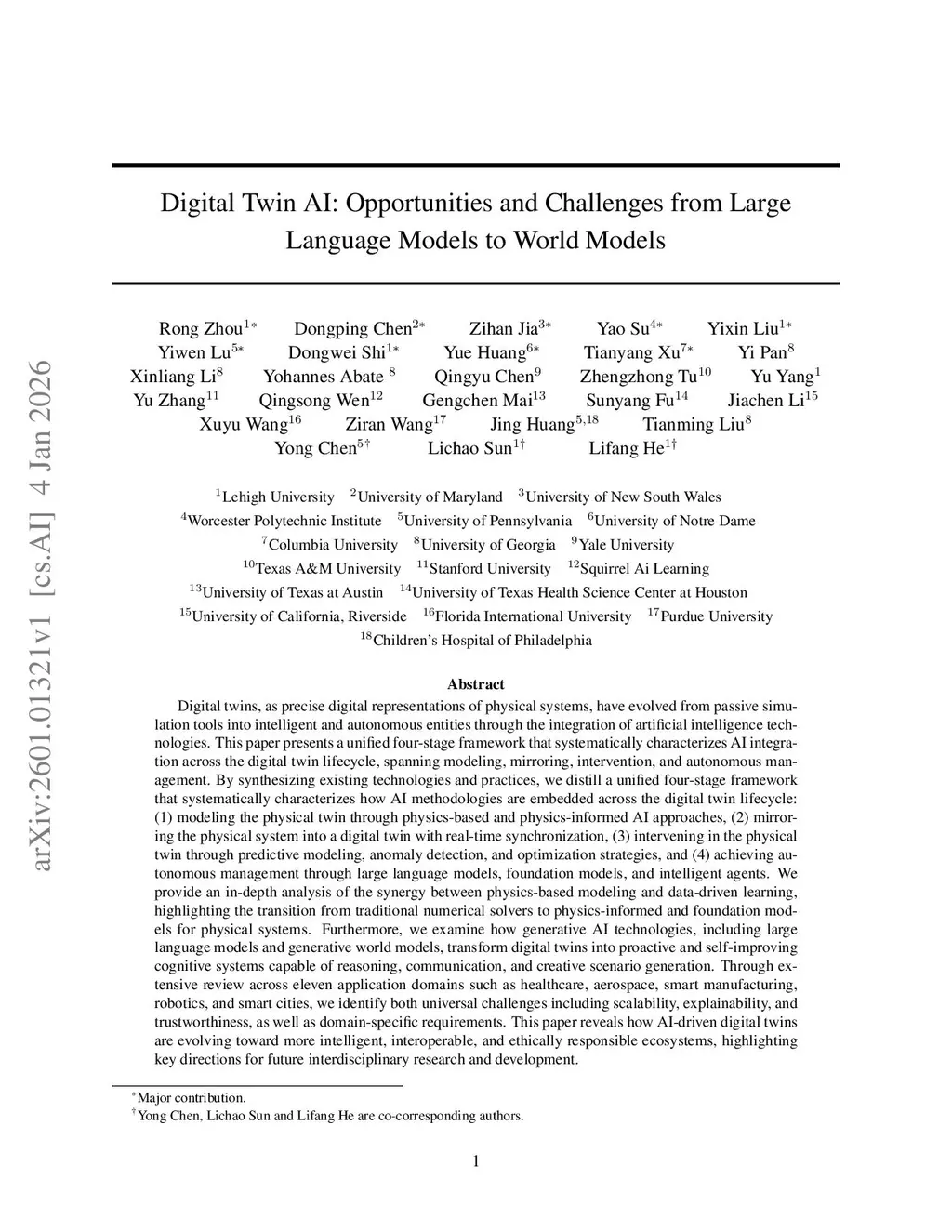 Digital twins, as precise digital representations of physical systems, have evolved from passive simulation tools into intelligent and autonomous entities through the integration of artificial intelligence technologies. This paper presents a unified four-stage framework that systematically characterizes AI integration across the digital twin lifecycle, spanning modeling, mirroring, intervention, and autonomous management. By synthesizing existing technologies and practices, we distill a unified four-stage framework that systematically characterizes how AI methodologies are embedded across the digital twin lifecycle: (1) modeling the physical twin through physics-based and physics-informed AI approaches, (2) mirroring the physical system into a digital twin with real-time synchronization, (3) intervening in the physical twin through predictive modeling, anomaly detection, and optimization strategies, and (4) achieving autonomous management through large language models, foundation models, and intelligent agents. We analyze the synergy between physics-based modeling and data-driven learning, highlighting the shift from traditional numerical solvers to physics-informed and foundation models for physical systems. Furthermore, we examine how generative AI technologies, including large language models and generative world models, transform digital twins into proactive and self-improving cognitive systems capable of reasoning, communication, and creative scenario generation. Through a cross-domain review spanning eleven application domains, including healthcare, aerospace, smart manufacturing, robotics, and smart cities, we identify common challenges related to scalability, explainability, and trustworthiness, and outline directions for responsible AI-driven digital twin systems.